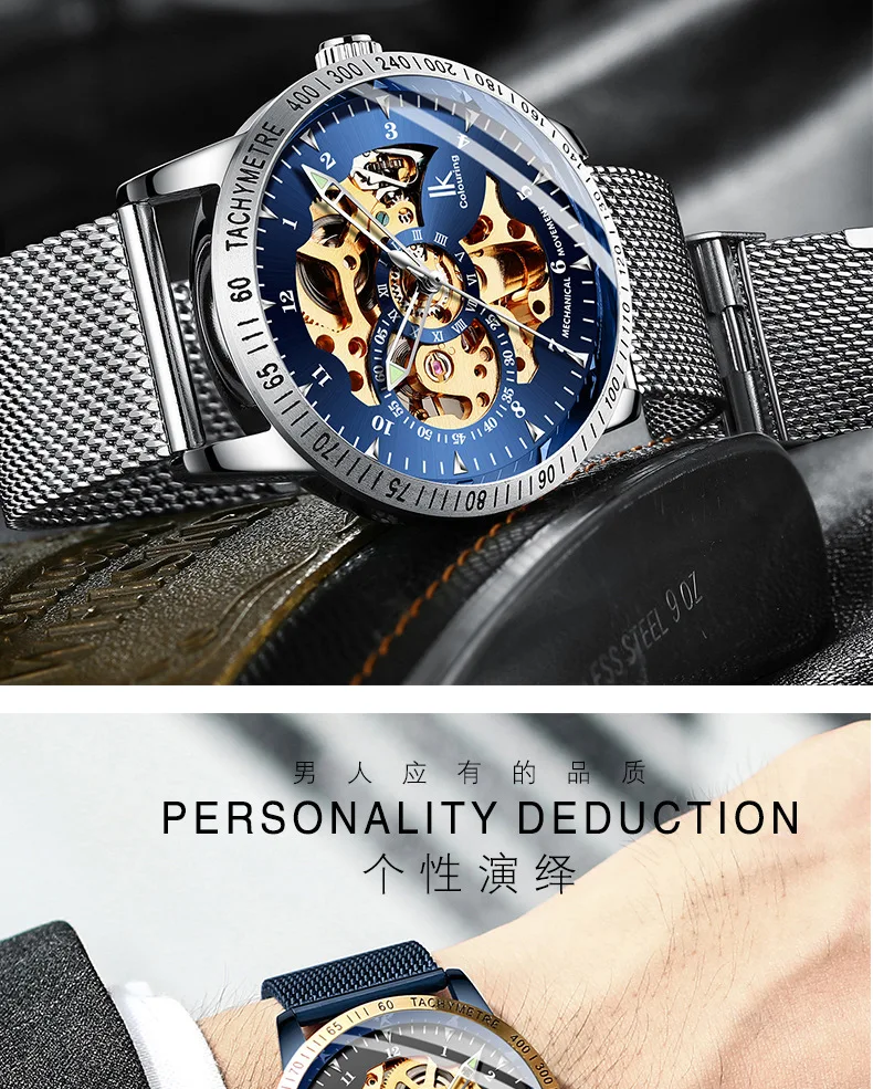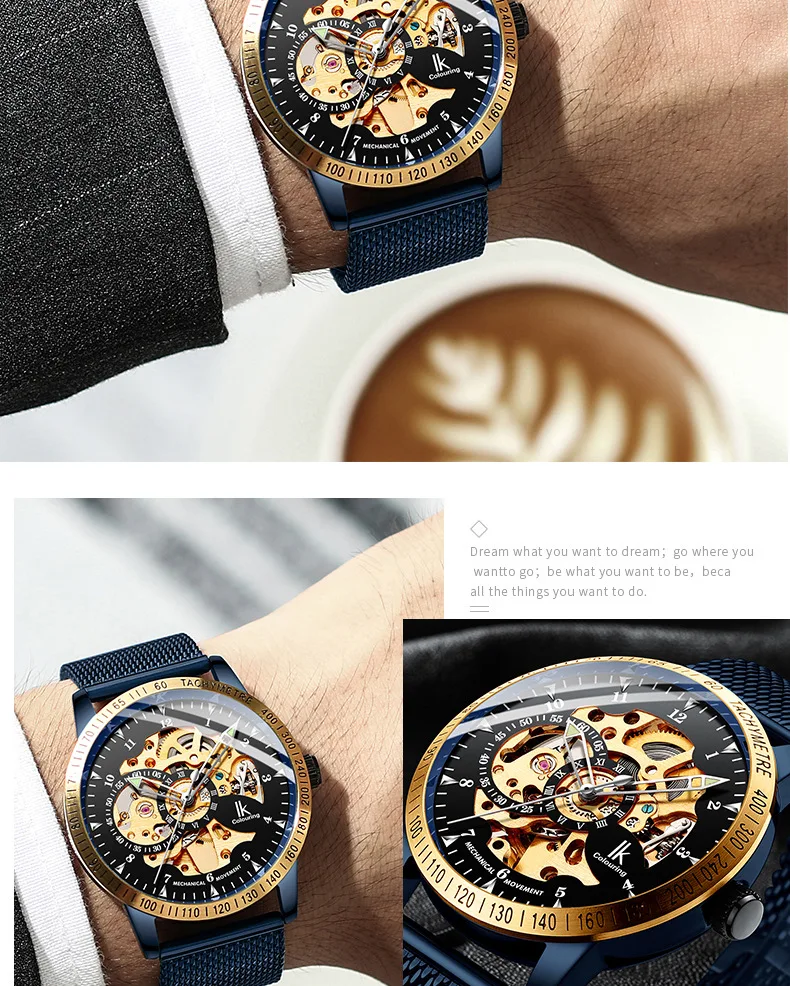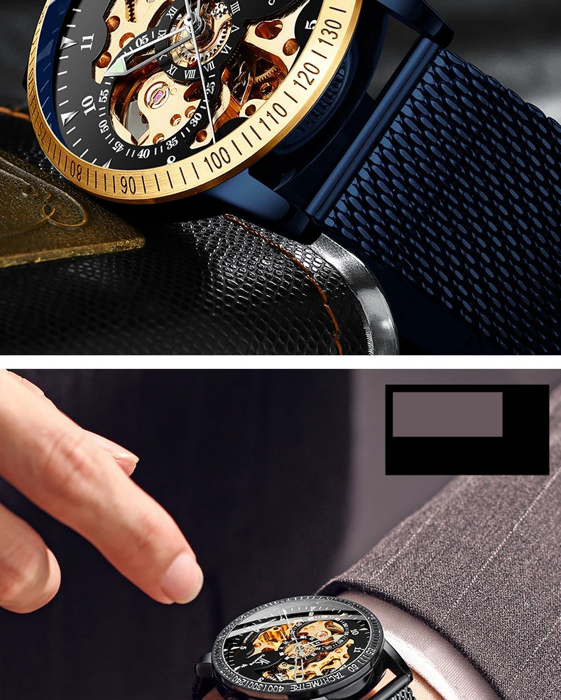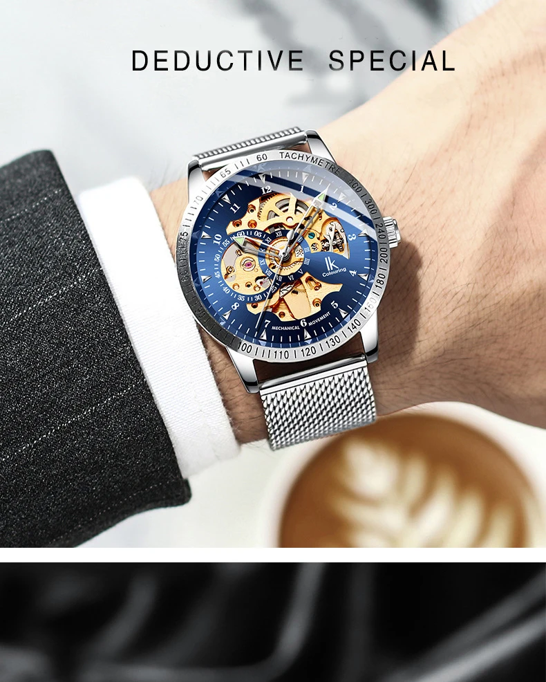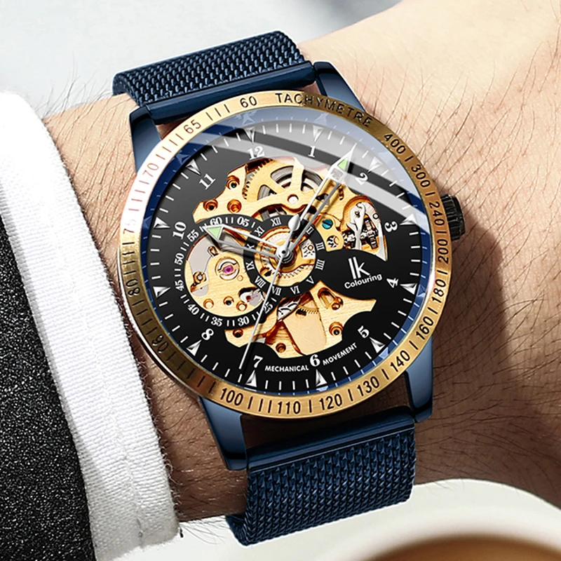 Распродажа купонов, мужские часы, сетчатый Браслет из нержавеющей стали, автоматические механические мужские часы-скелетоны, мужские наручные часы, мужские часы
