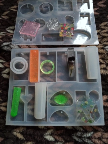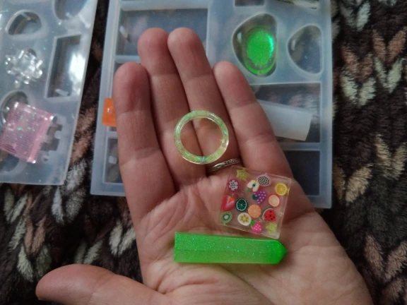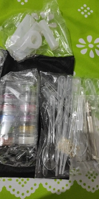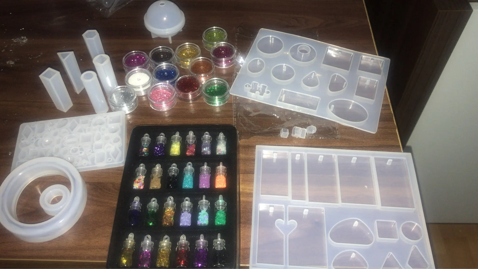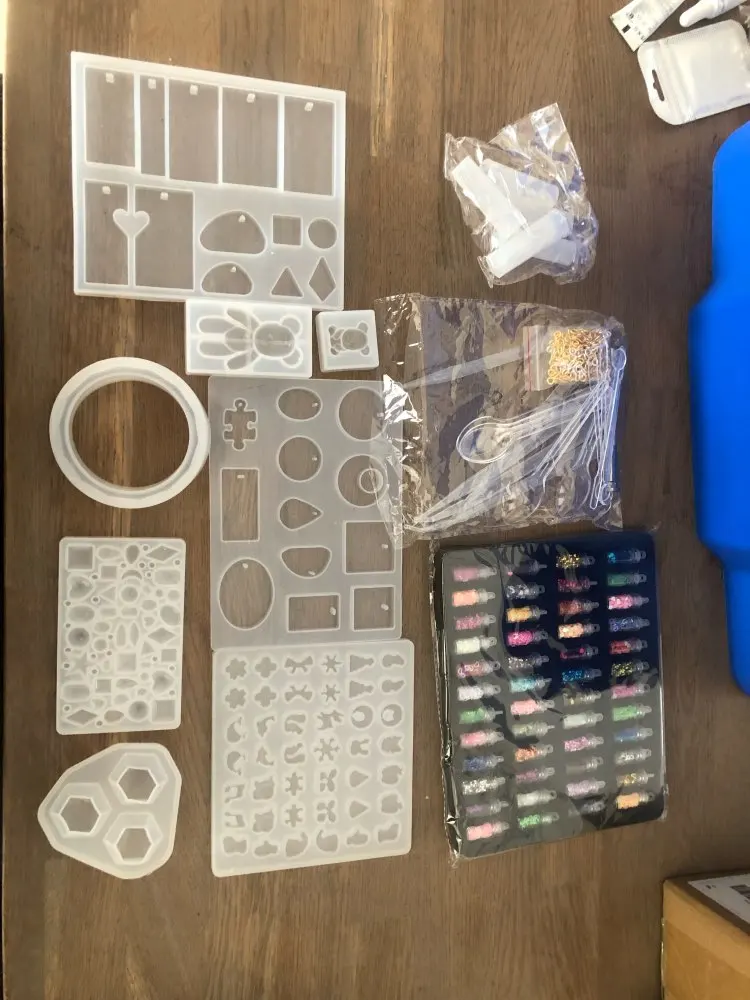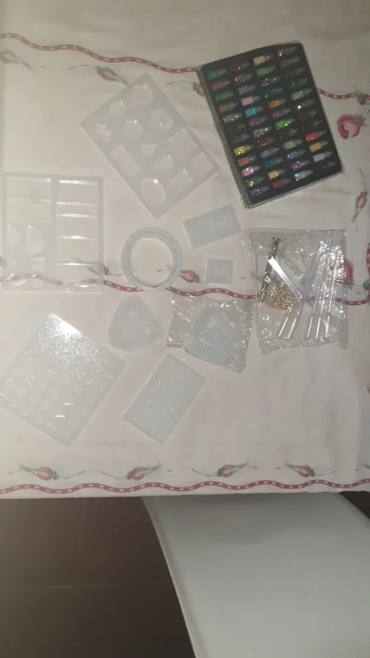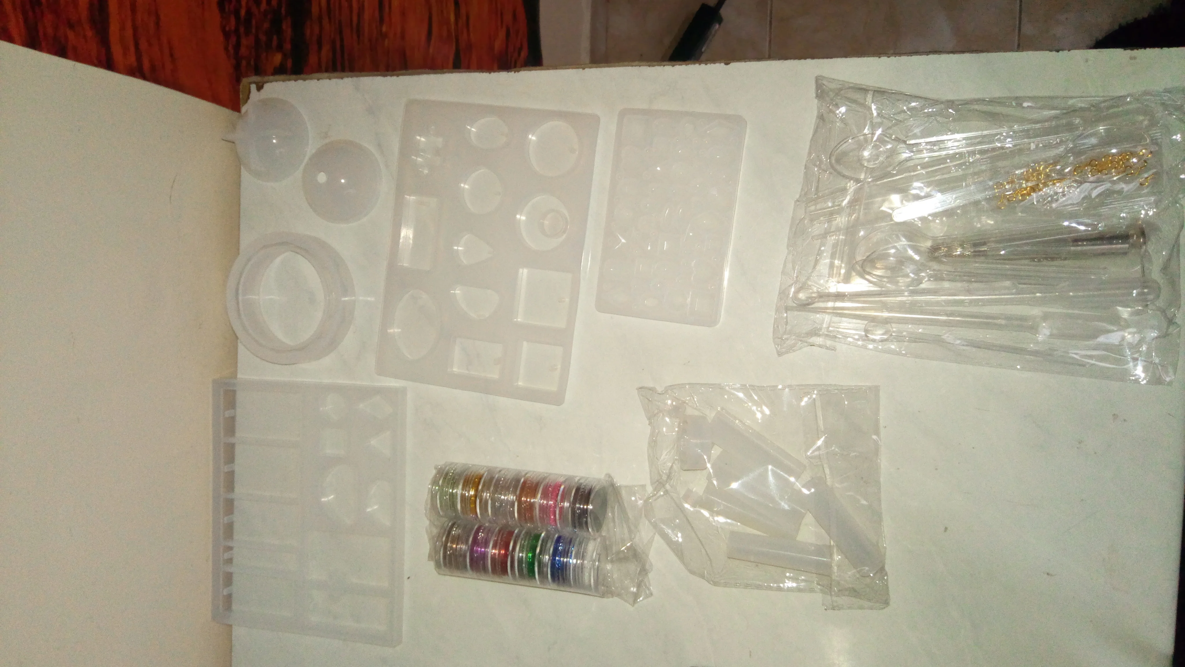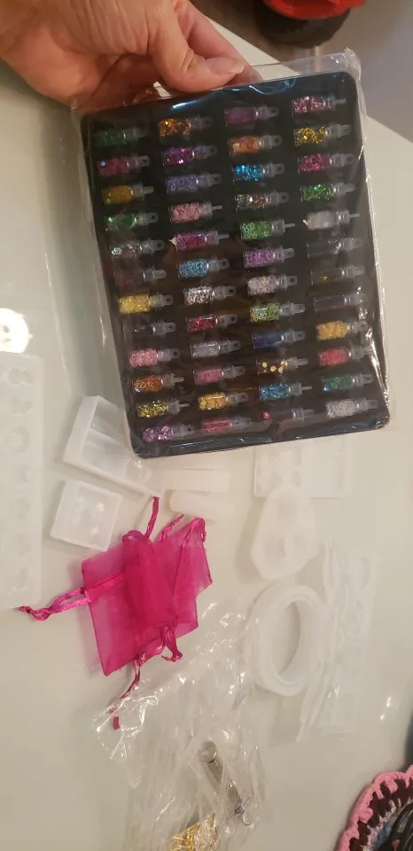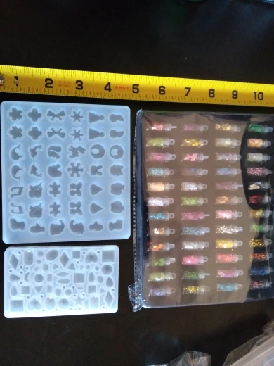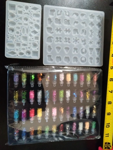 Потрясающе! Отличный комплект по цене! Нет указания или смолы, но много форм блеска для форм. Они различных размеров и только односторонние плоские формы, но также поставляются с полными 3d фигурами и инструментами! Доставка в Калифорнию в течение 14 дней! Яй!