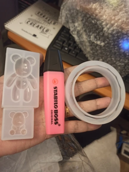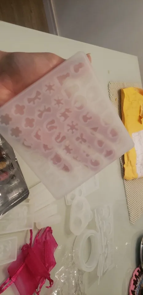 плюс к фото в наборе есть формы большого и маленького мишки, кристалла с 12 гранями, круглый вытянутый кристалл, вытянутый кристалл с 6 и 4 гранями. также форма браслета, 5 одноразовых ложек, 5 мини-лопаточек, 5 пипеток и 4 набора крючков для крепления подвески.