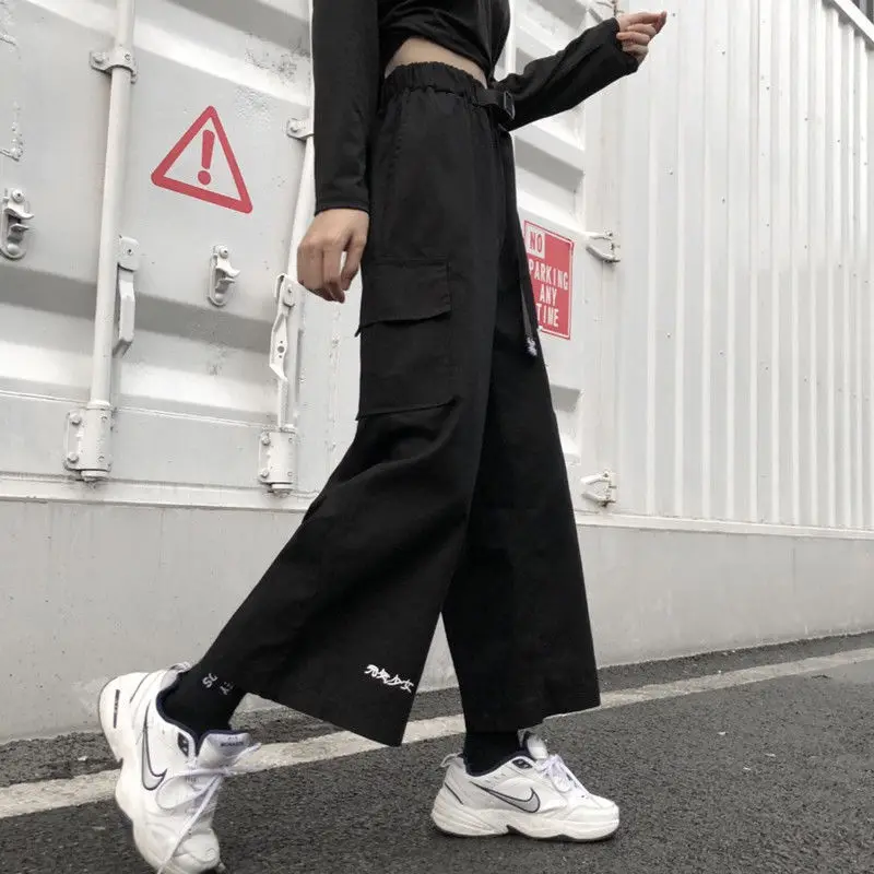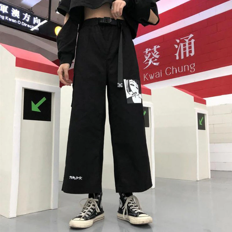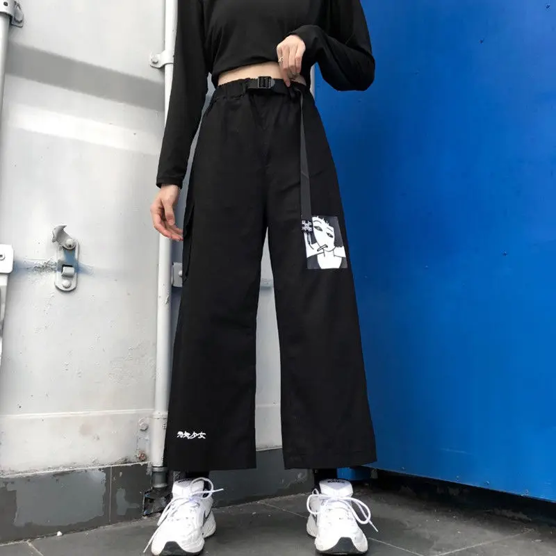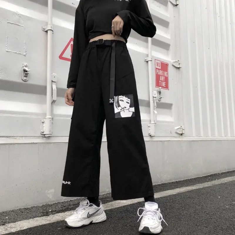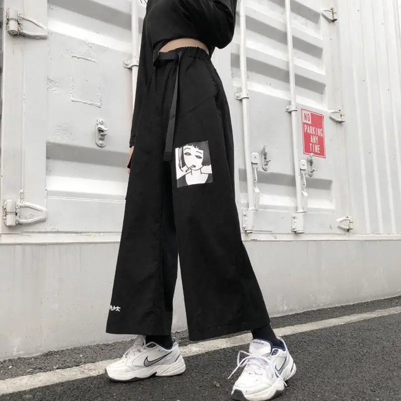 Брюки женские мешковатые штаны с поясом, джоггеры с завышенной талией и широкими штанинами, Модные свободные штаны в Корейском стиле, с аниме принтом, в стиле Харадзюку