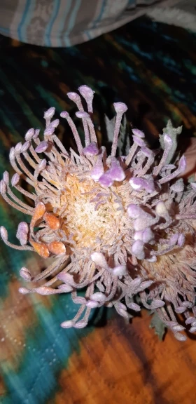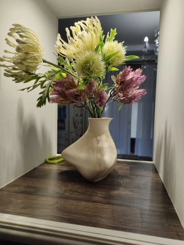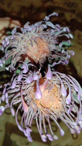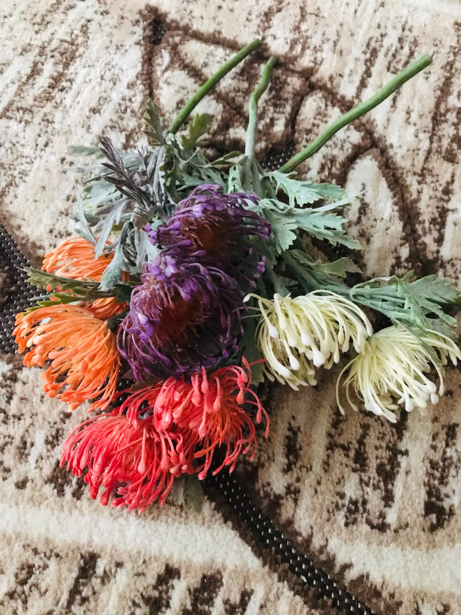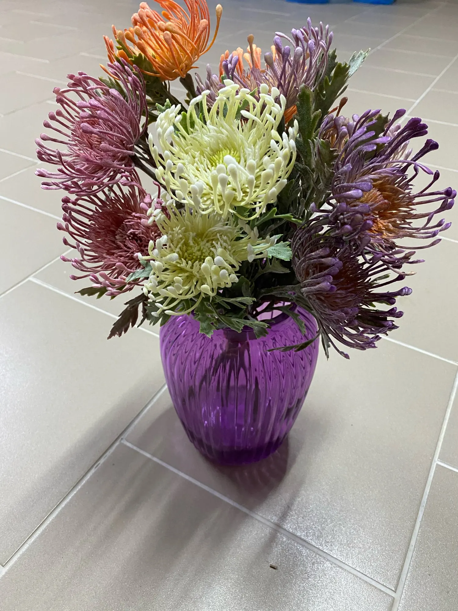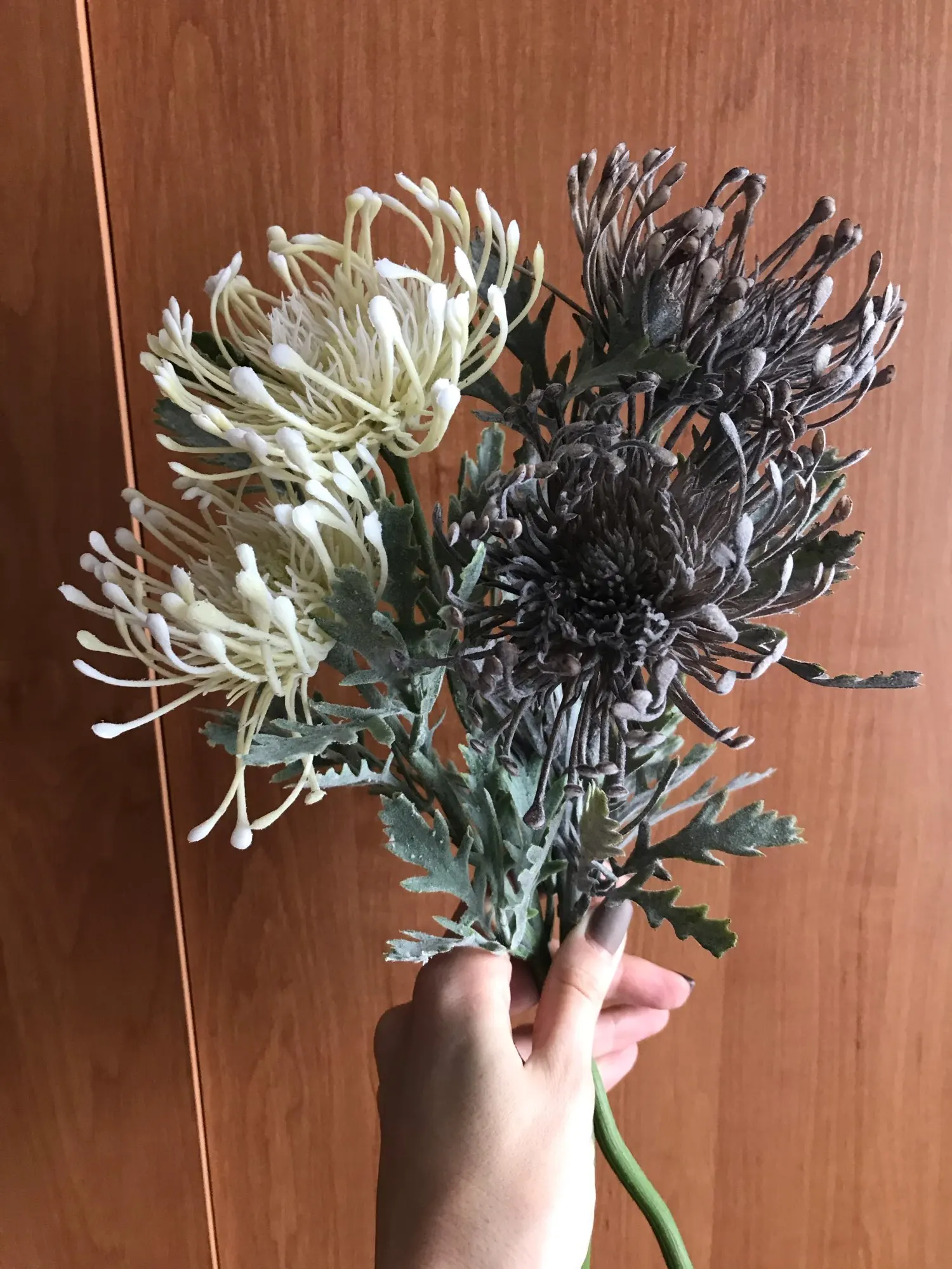 Очаровательные цветы! Листики и ствол с напылением. Ну а сами цветочки просто чудо какое- то! А цвета какие! У меня серый, сливовый, сиреневый и шампань. Не очень высокие. Покупала с 3 головами. Они были длинные и я их укорачивала. Эти под стандартную вазу идеальны.
