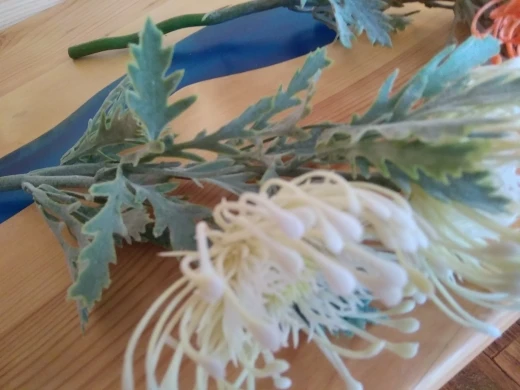 Фото товара очень точно передало и цвет лепестков, и цвет листвы. О ней хочется сказать особо: листва, словно бархатная, припыленная белым налетом, как инеем. Я заказывала цветы для новогодних композиций, поэтому мне важно, что можно будет использовать не только головки цветов, но и листву. Буду заказывать ещё. Заказ пришел раньше указанного срока доставки, легко отслеживался. Однозначно рекомендую и товар, и продавца. Большое спасибо! Успехов!