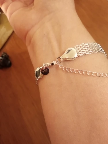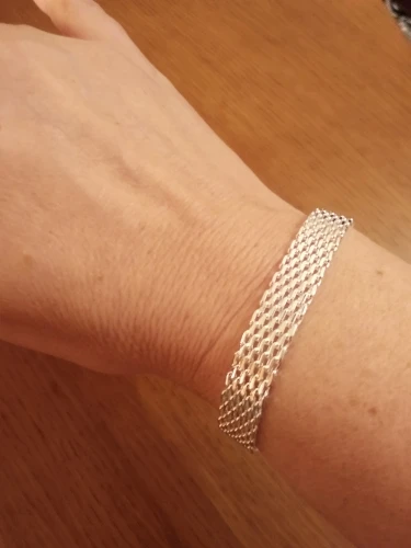 Браслет красивый и Размер Идеальный! Месяц, когда я ношу его каждый день, и я держу его в душе, он не двигался. Это действительно очень хорошего качества, вы можете заказать с закрытыми глазами Единственный недостаток, его сетки имеют тенденцию вешать все свитера, которые я ношу