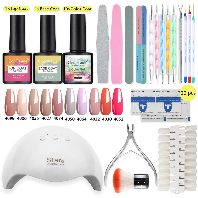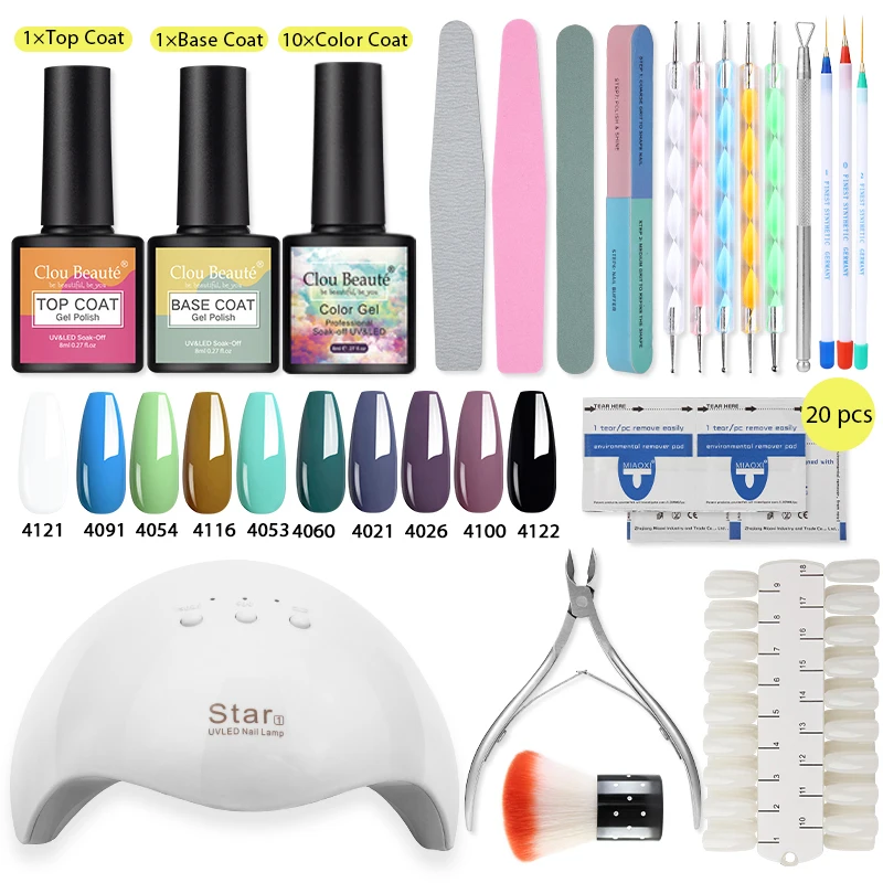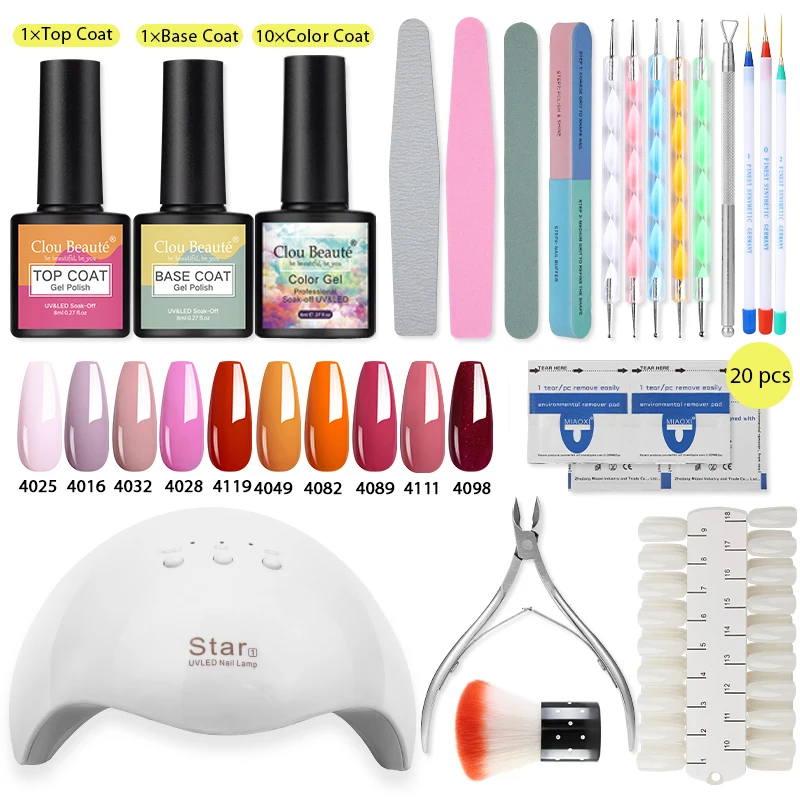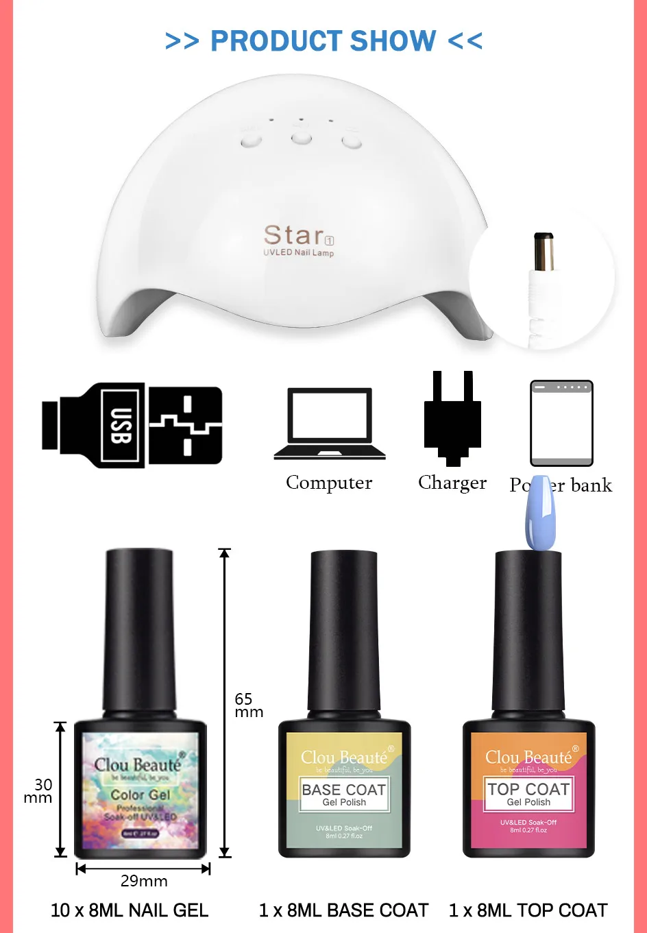Набор для ногтей Clou Beaute, 12 Вт, УФ светодиодный Лампа для маникюра, 10 шт. гель-лаков, 8 мл, верхняя база, Полупостоянный лак, инструменты для дизайна ногтей