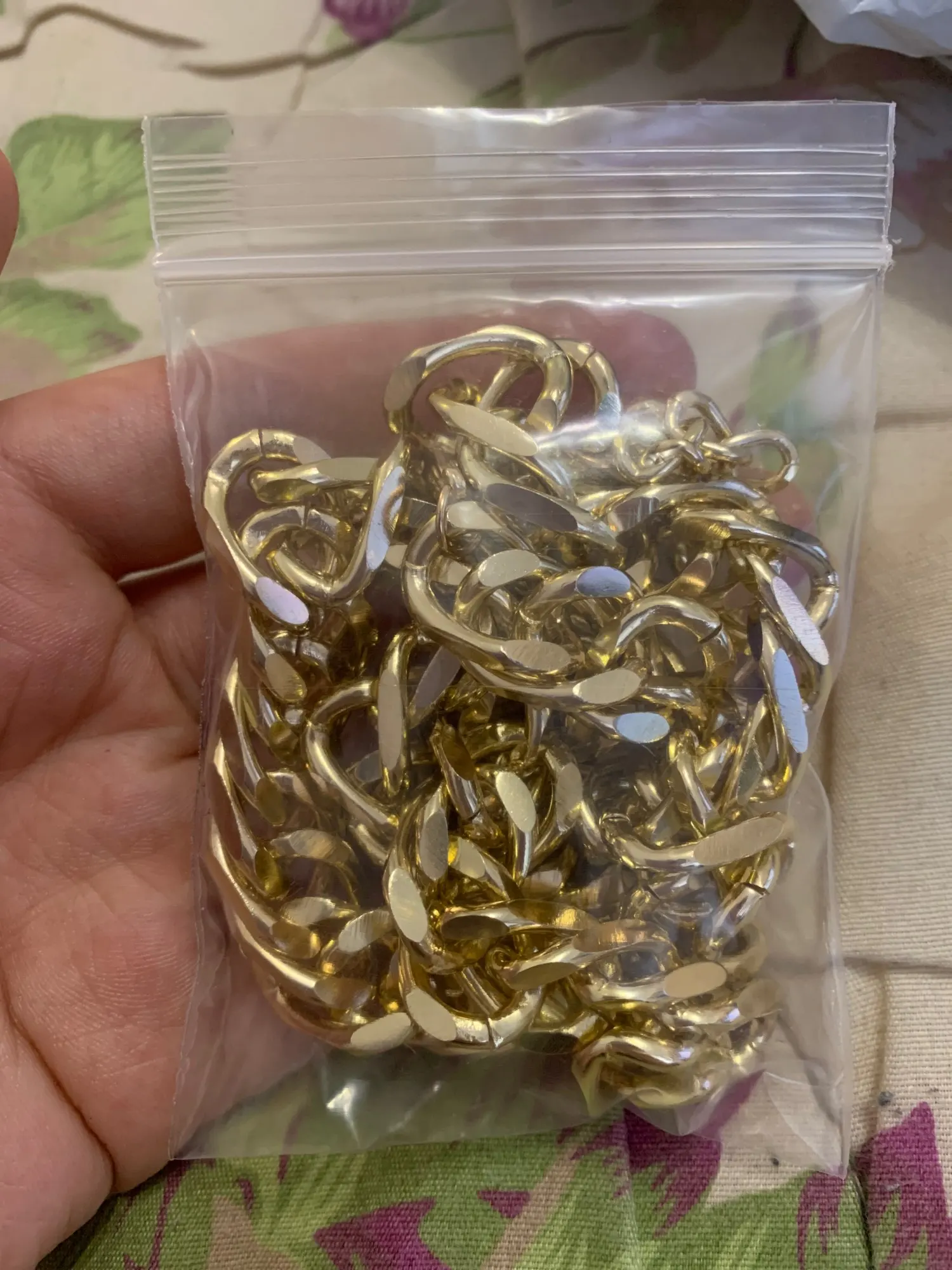 Цепь конечно гремит знатно ещё когда в пакете была, по громыханию поняла что там она. На вид как в описании на фото. Лёгкая очень, в одном месте есть добротный скол, но мне на пару раз для фотосессий самое оно. Продавец всегда был на связи