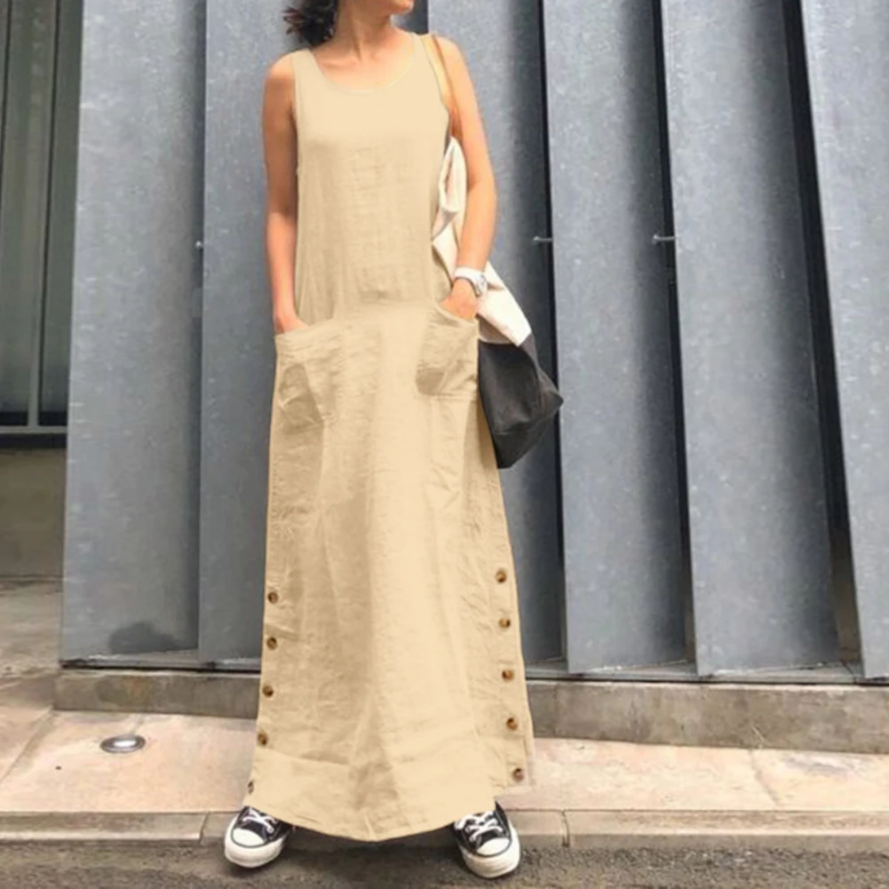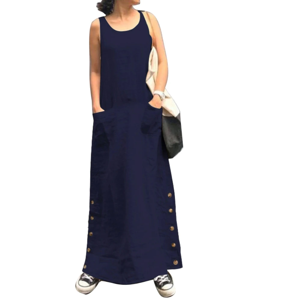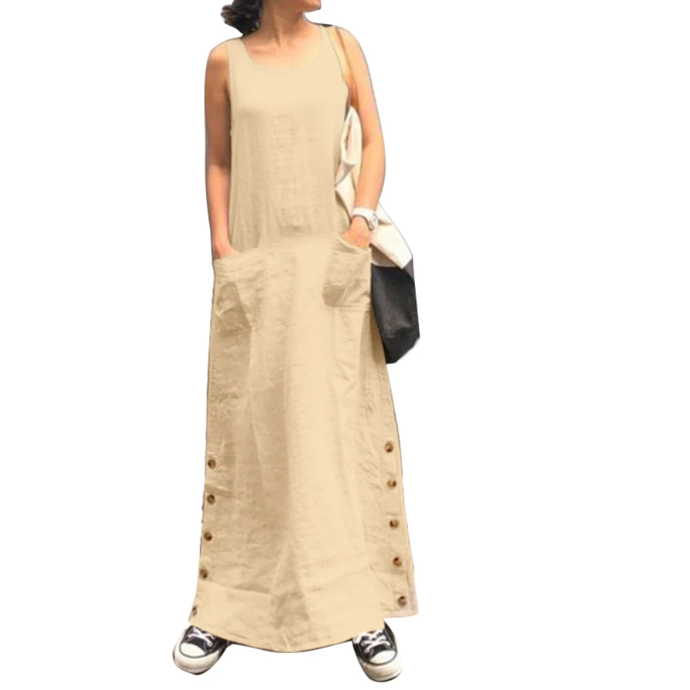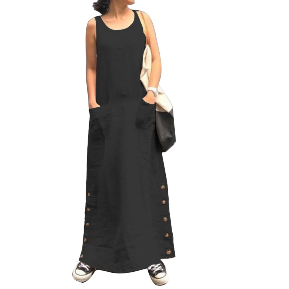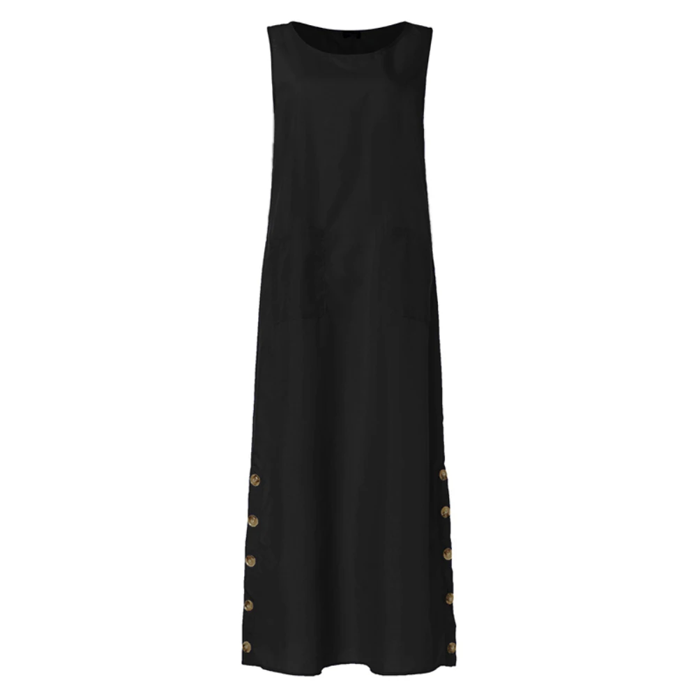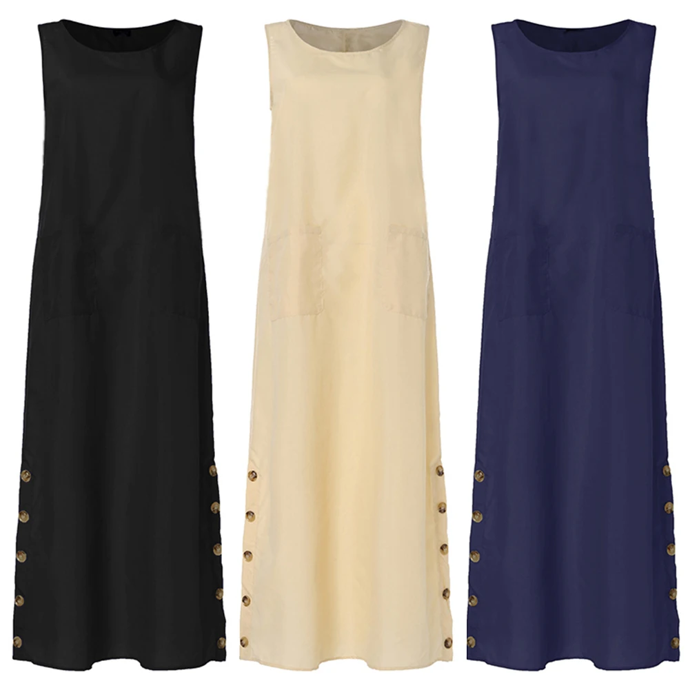 Женское винтажное платье на пуговицах, однотонное свободное платье без рукавов, с круглым вырезом и карманами, 5XL, на лето