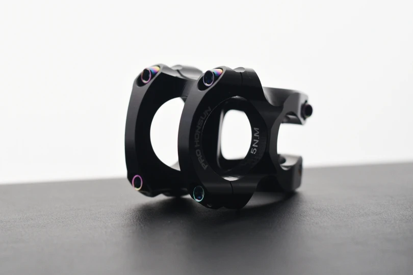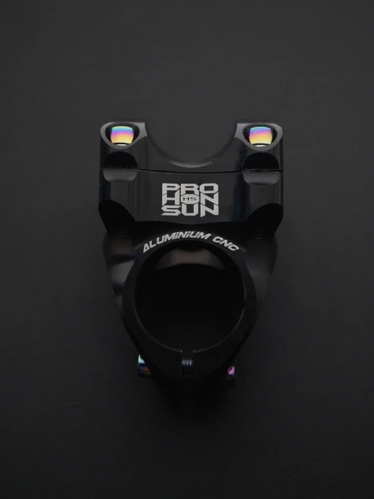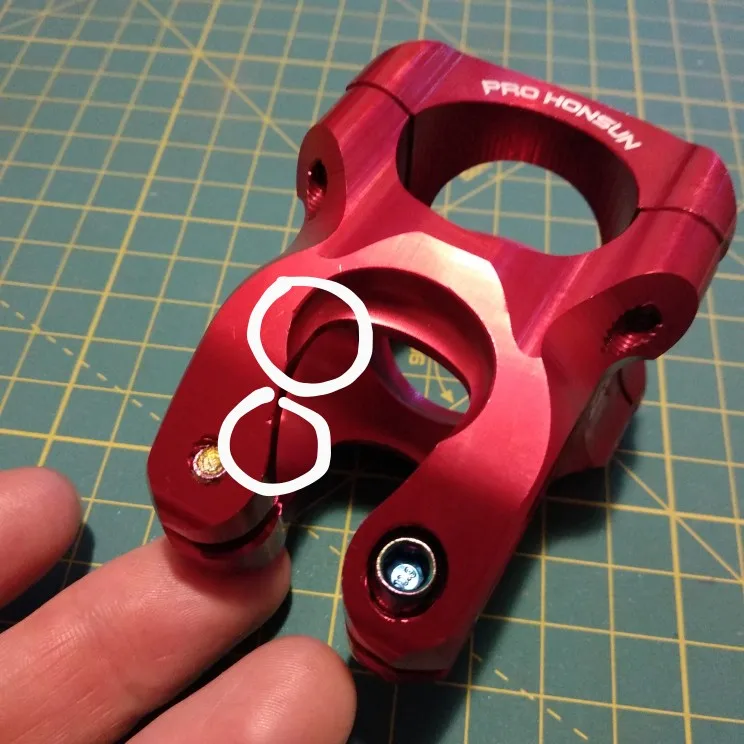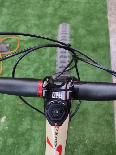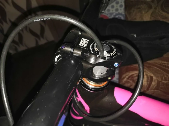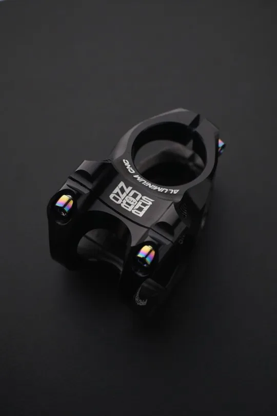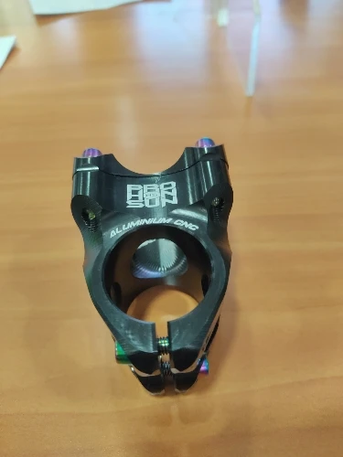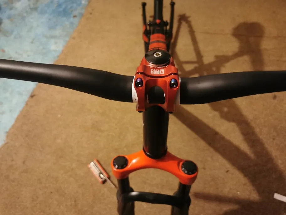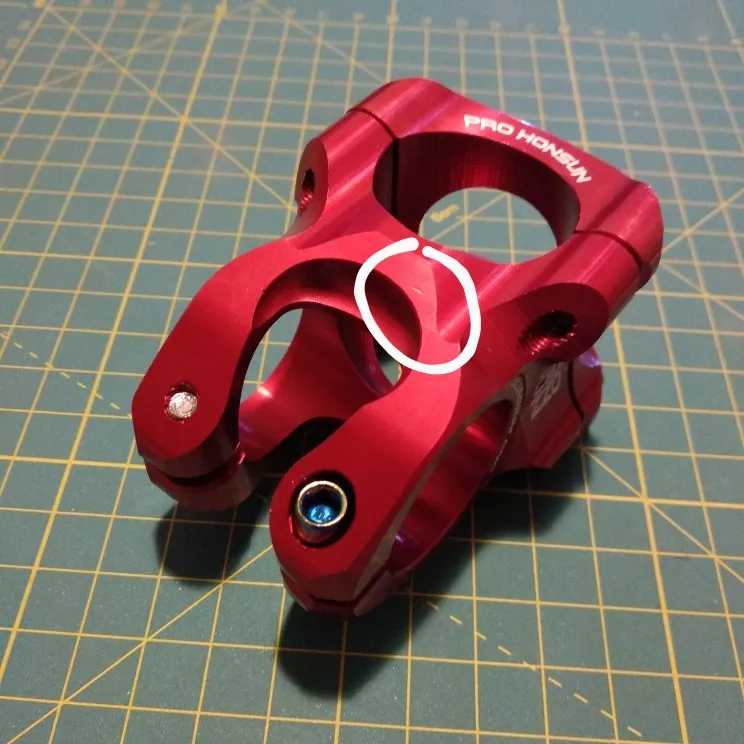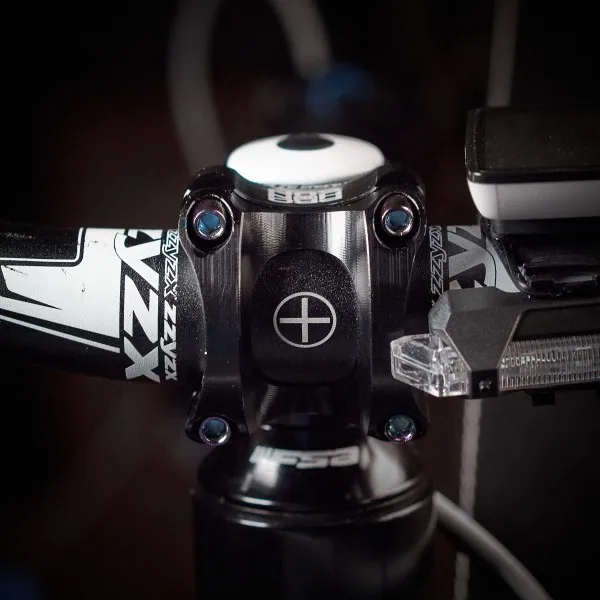 Вынос стильный, лёгкий, естественно, максимально короткий. Приятные очертания, аккуратная обработка, адекватные шрифты и ничего лишнего. Болты с плотным контактом под шестигранник, но забавные внешне. Их можно и поменять в местном магазине, если вам имитация такого стиля не понравится. Вынос полностью симметричен: форма и надписи одинаковы сверху и снизу. Приятно, что при разумном затягивании на руле 31,8 зазоры сверху и снизу получаются совсем маленькие, примерно по 1 мм, так что выровнять их нетрудно. Из минусов: крышка рулевой немного наплывает на надпись про алюминий :)