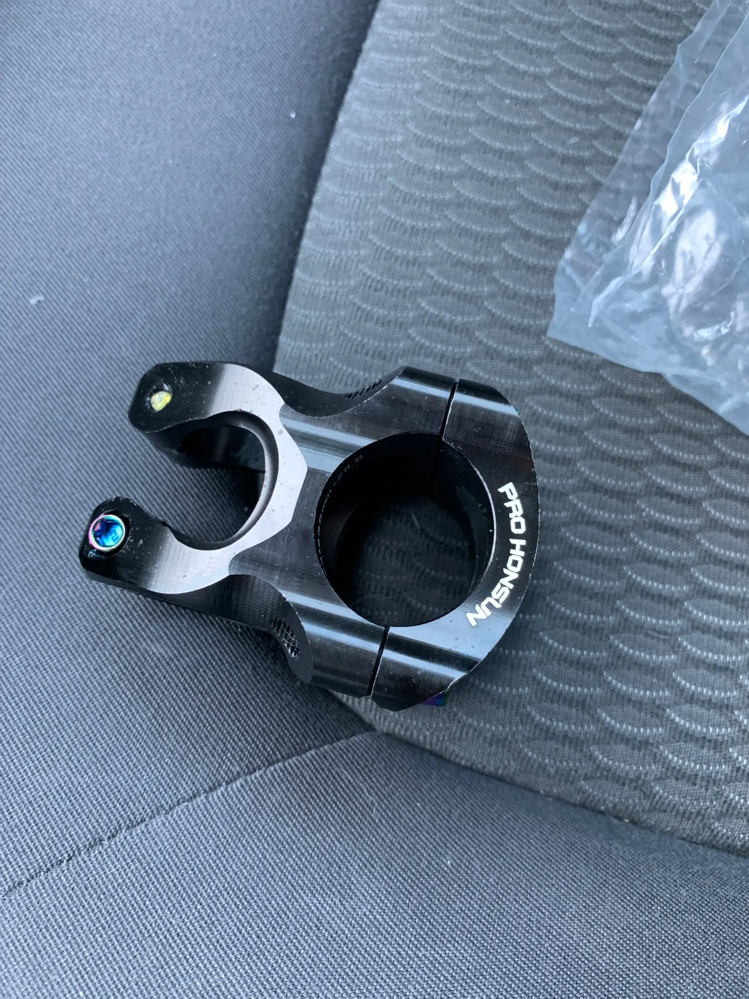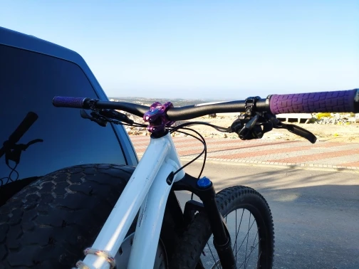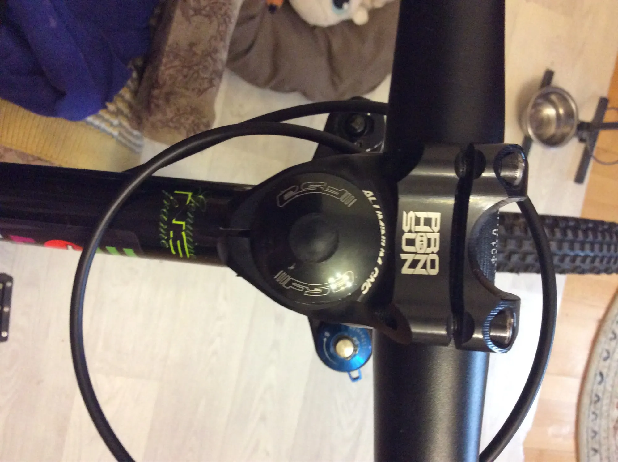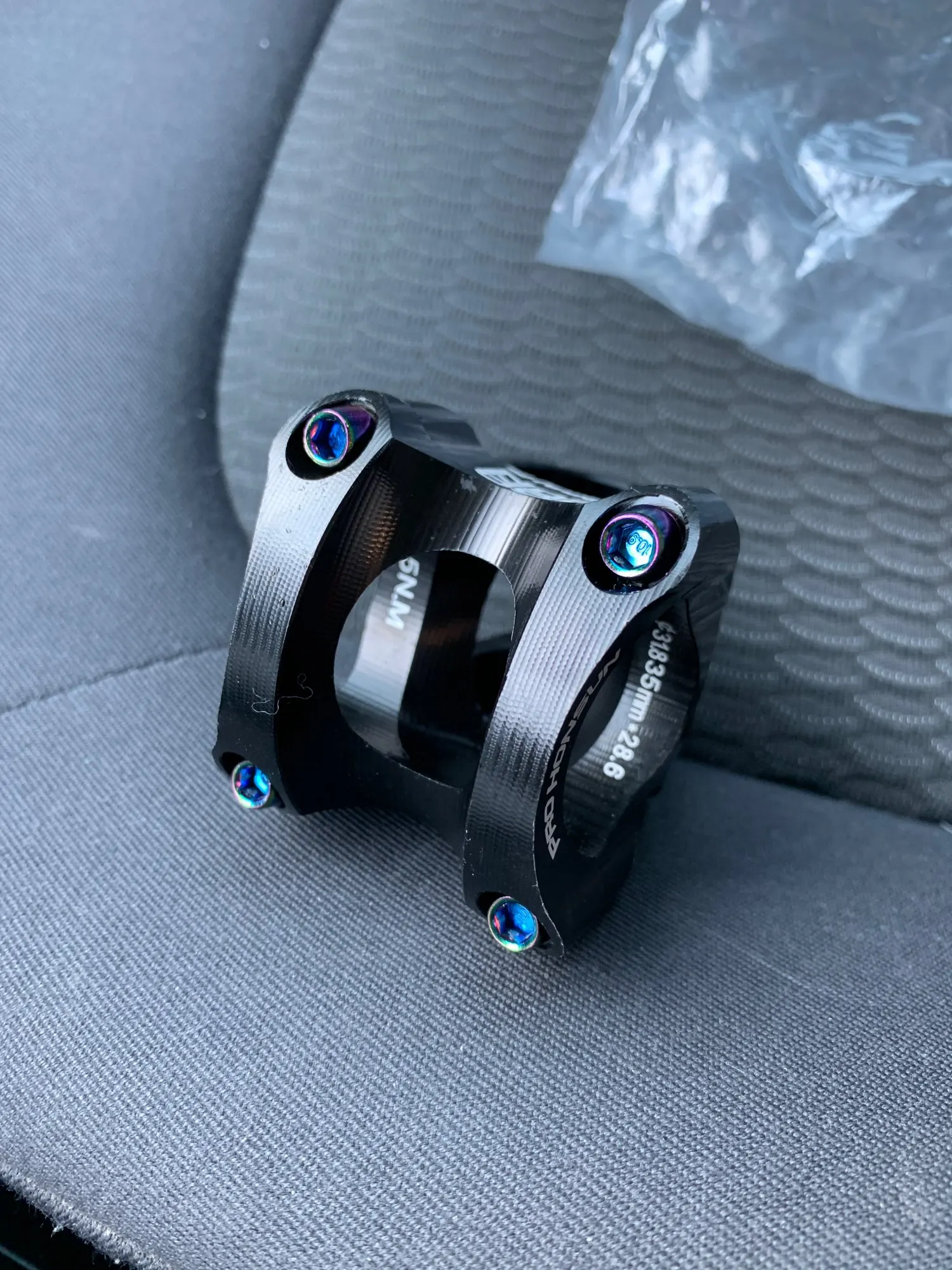 Вынос стильный, лёгкий, естественно, максимально короткий. Приятные очертания, аккуратная обработка, адекватные шрифты и ничего лишнего. Болты с плотным контактом под шестигранник, но забавные внешне. Их можно и поменять в местном магазине, если вам имитация такого стиля не понравится. Вынос полностью симметричен: форма и надписи одинаковы сверху и снизу. Приятно, что при разумном затягивании на руле 31,8 зазоры сверху и снизу получаются совсем маленькие, примерно по 1 мм, так что выровнять их нетрудно. Из минусов: крышка рулевой немного наплывает на надпись про алюминий :)