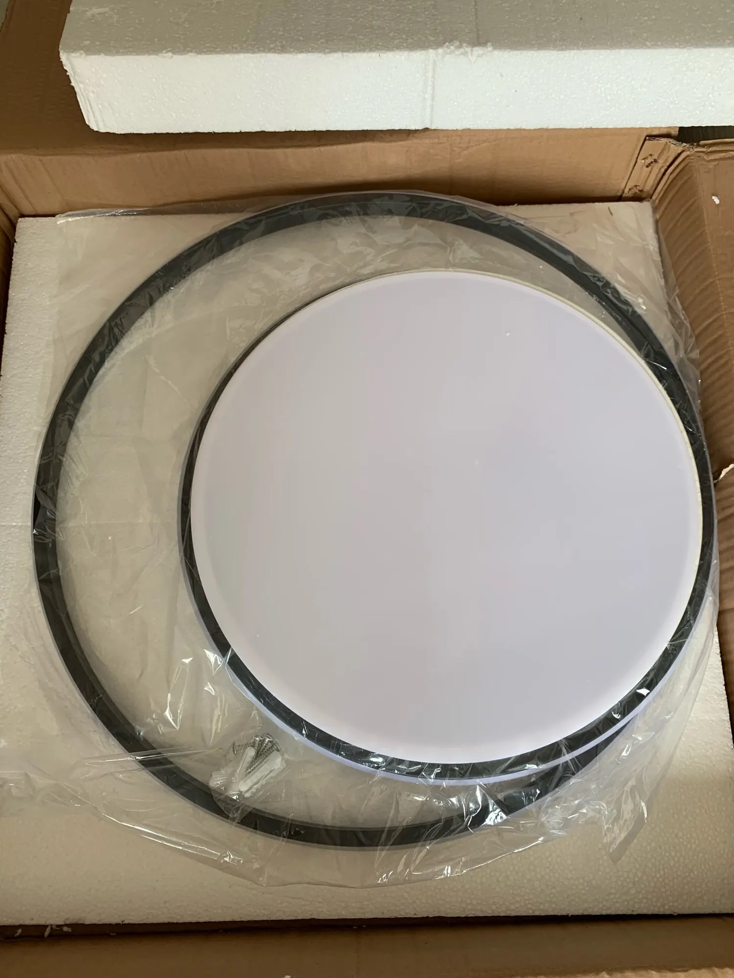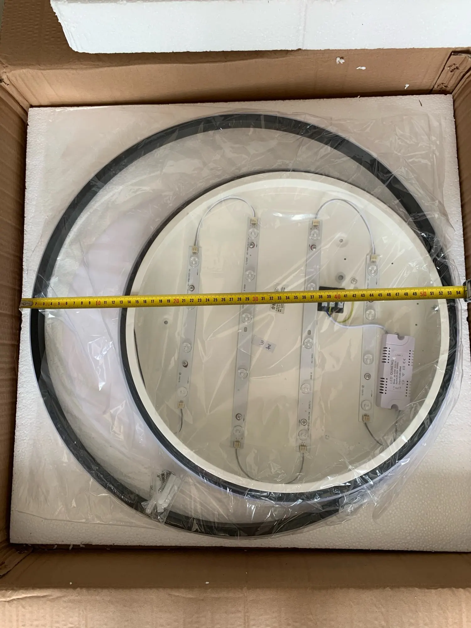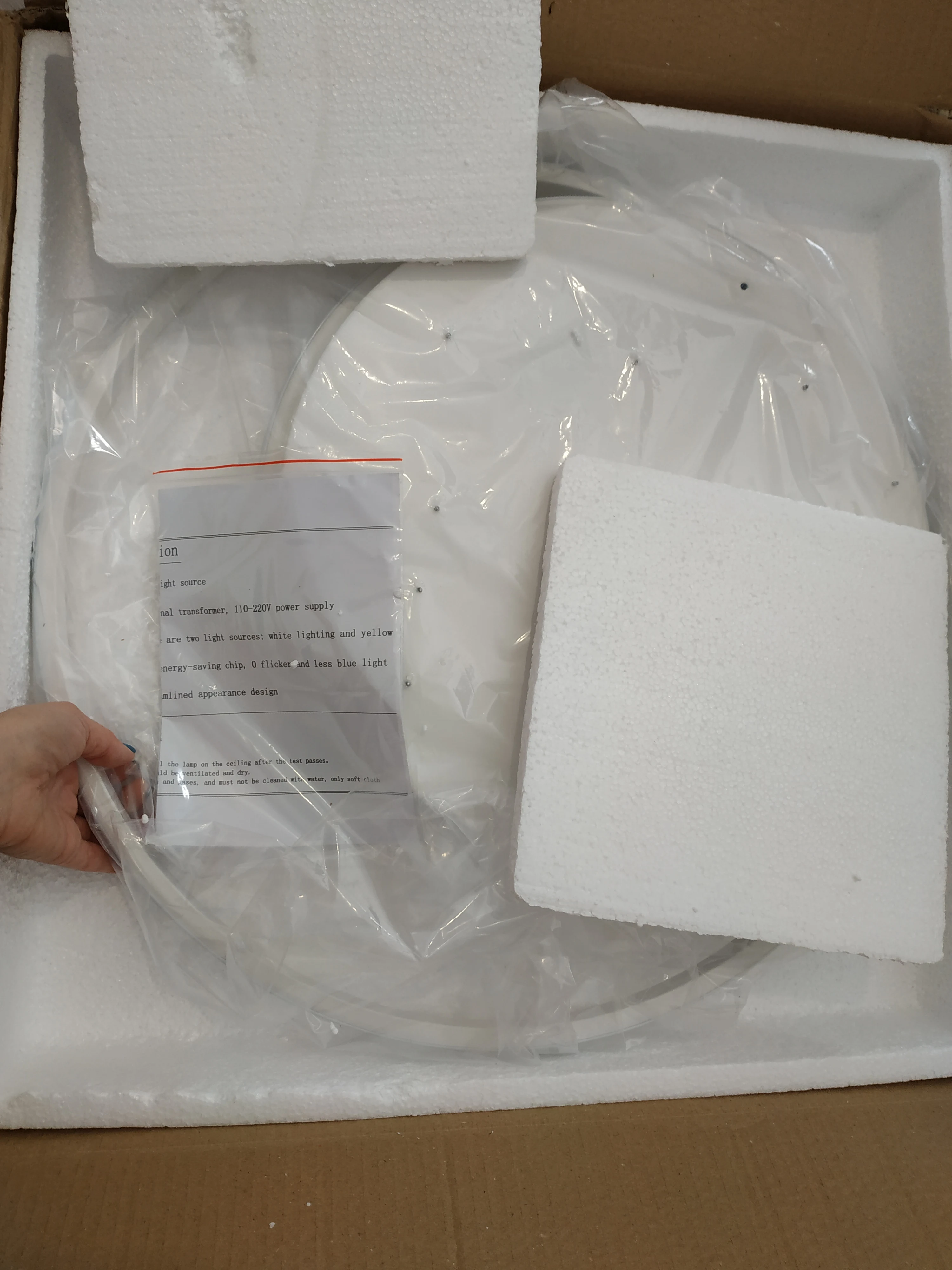 Доставка очень долгая, за то до двери и бесплатно. Лампа очень яркая. Светит отлично. Из минусов, в комплекте не оеазалось криплений к потолку, пришлось дадумывать самому. Немного замят обод. Долго разбирался с пультом так как продавец написал про кнопку On а оказалось кнопка setup. В остальном все отлично. Даже батареки к пульту в комплекте.