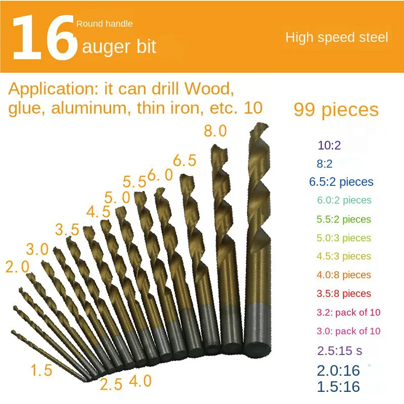 Спиральное сверло из быстрорежущей стали с титановым покрытием, белая ручная электродрель, 102025506099 шт., круглая ручка