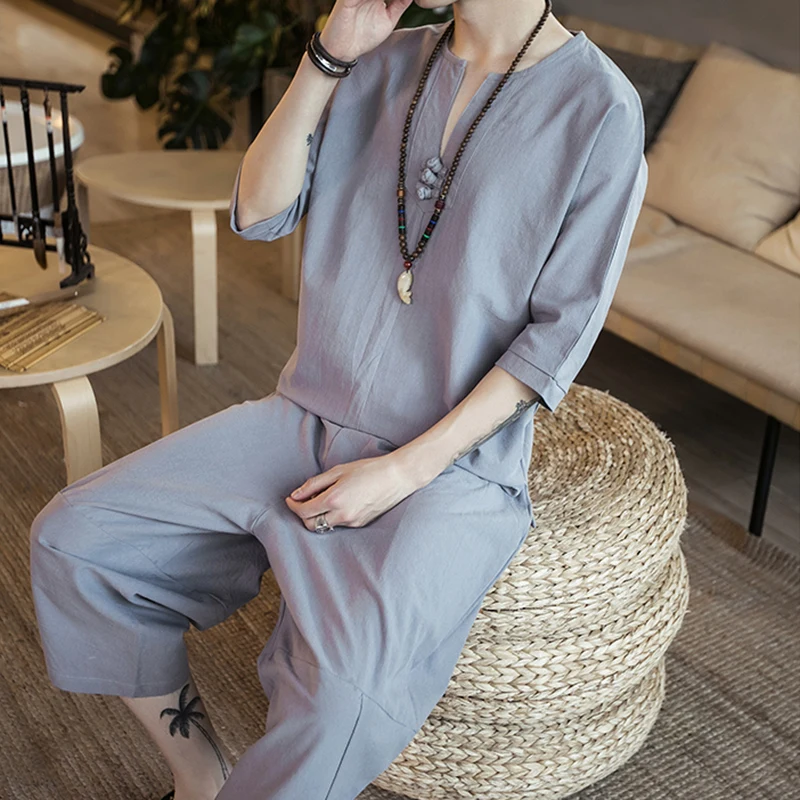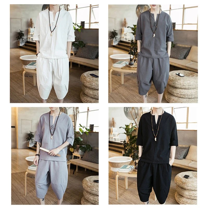 Мужской Тонкий льняной костюм, из хлопка и льна, с коротким рукавом