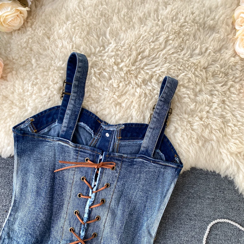 Комбинезон женский джинсовый пляжный с открытой спиной, на шнуровке