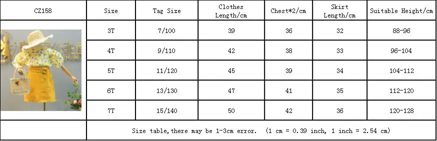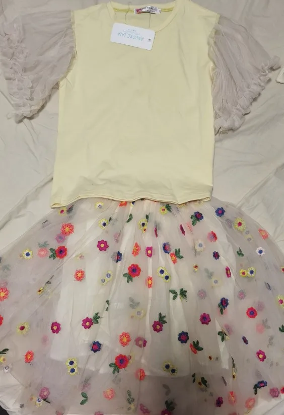 Komplet dziewczęcy w rozmiarze 4t wypada na nasze 104/110 Wymiary: Bluzka Szerokość:33cm Dlugosc:40cm Spodniczka: Długość: 39cm (podszewka 28cm) Szerokość w pasie: 23 cm rozciągliwa do 34cm. Całość pięknie się prezentuje ma taki żółtawy kolor bardzo jasny Bluzeczka ma ozdobne tiulowe rekawki a reszta jest wykonana z mieszanki bawelny i jakiegoś sztucznego dodatku. Ładnie się uklada i jest starannie wykonana. Spodniczka w kwiatowy wzor podoba mi się najbardziej . Ma piekne żywe kwiaty, jest wykonana starannie i ma miękki tiul. Podszewka to bawelna . Polecam.
