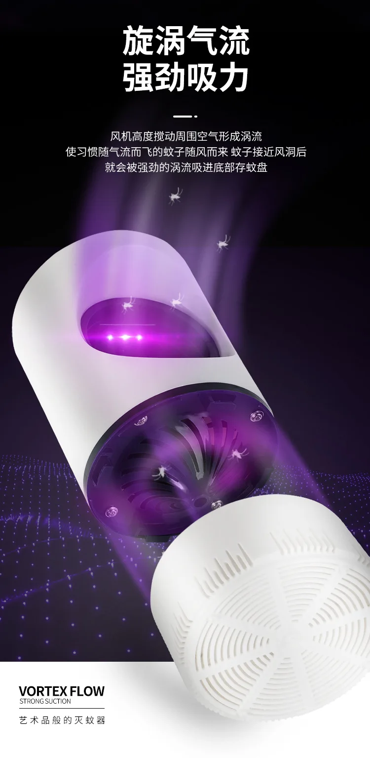 1. gemakkelijk doden muggen: de 365nm bionische violet licht wave verbetert de attractie van muggen door het menselijk bionica technologie, waardoor precieze mug trapping. Het heeft een ingebouwde gestroomlijnde 360-graden zuig fan, en muggen naderen de vlucht vanuit elke richting zal worden meegezogen in val, en stierf door tsteueffecturing.