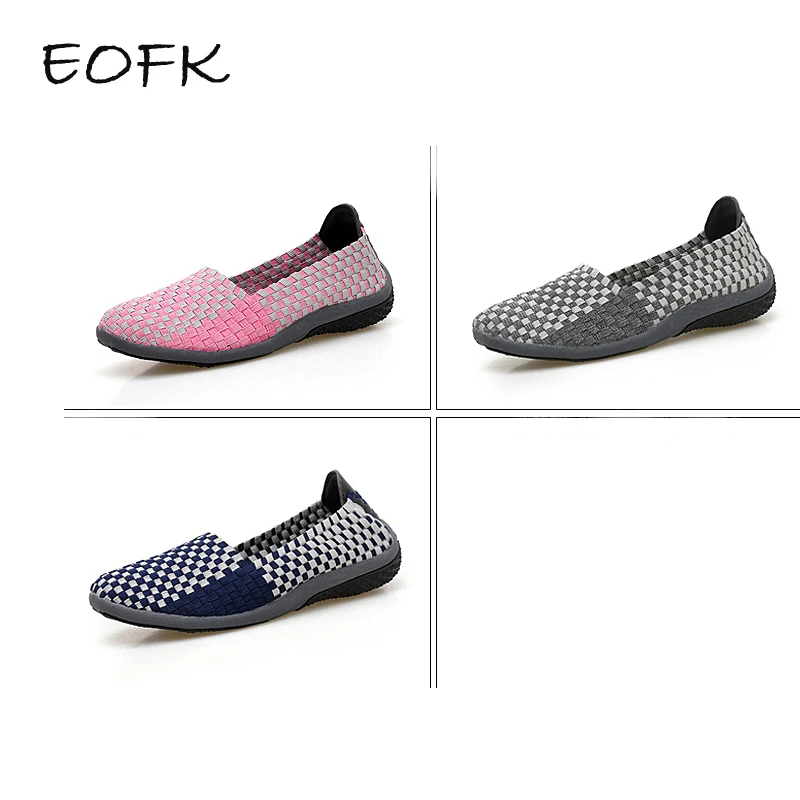 EOFK2020 летняя дышащая женская тканая обувь ручной работы; Эластичная тканая обувь на плоской подошве без шнуровки; Женская обувь на плоской подошве из нейлона в клетку