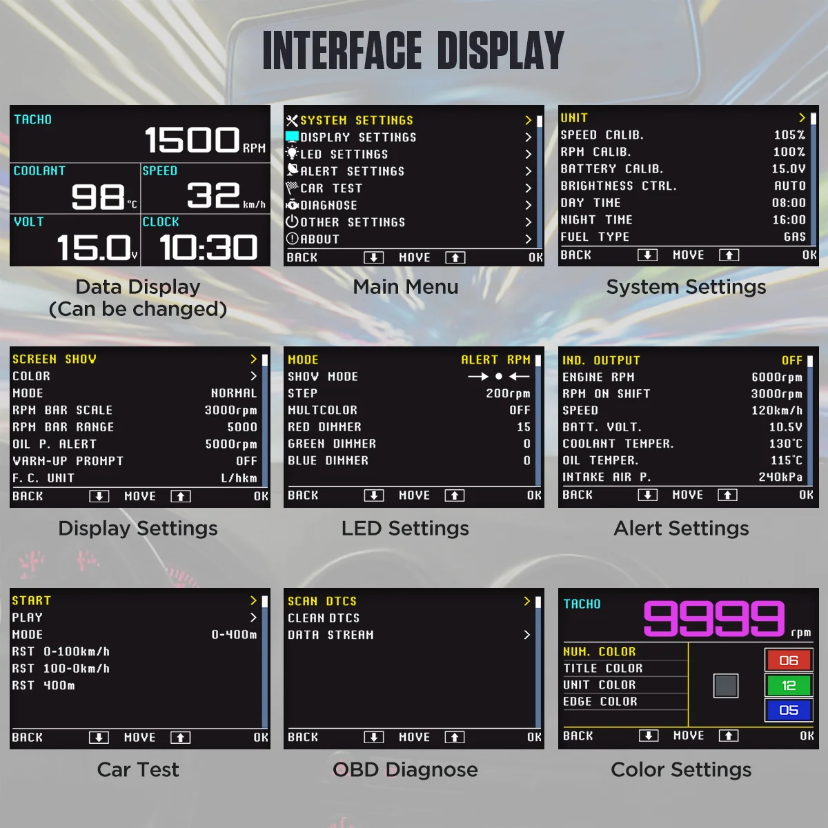 1. Спидометр,2. Тахометр,3. Текущий пробег,4. Общий пробег,5. Датчик температуры воды,6. Датчик температуры масла, измеритель расхода топливаМгновенный расход топлива, средний расход топлива, почасовой расход топлива7. Датчик давления на входе турбины,8. Угол зажигания,9. Отверстие дроссельной заслонки,10. Электронные часы11. Напряжение батареи,12. Напряжение зарядки двигателя Предупреждение Функция -- температура воды при стирке Предупреждение, сигнализацию перегрузки, напоминание о смещении, транспортное средство, mal Функция ПредупреждениеПрофессиональное оборудование-поток данных OBD, сканирование кода неисправности, очистка кода неисправности