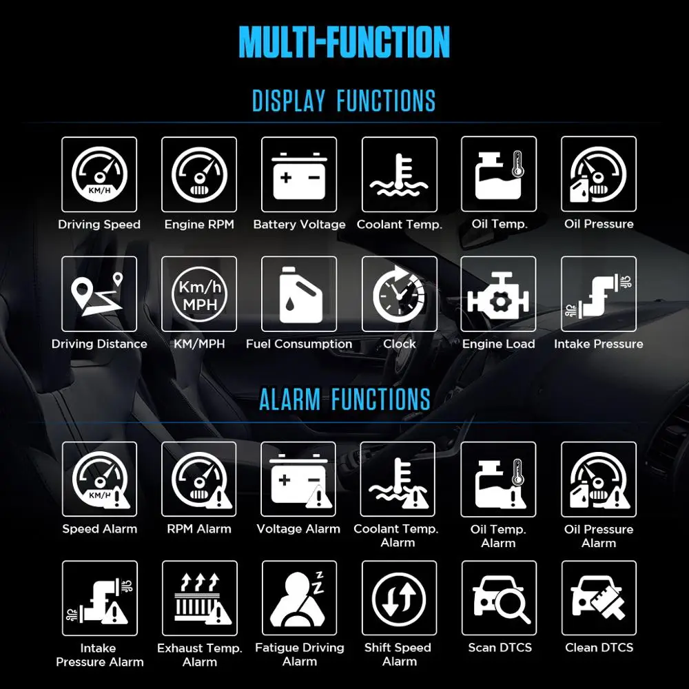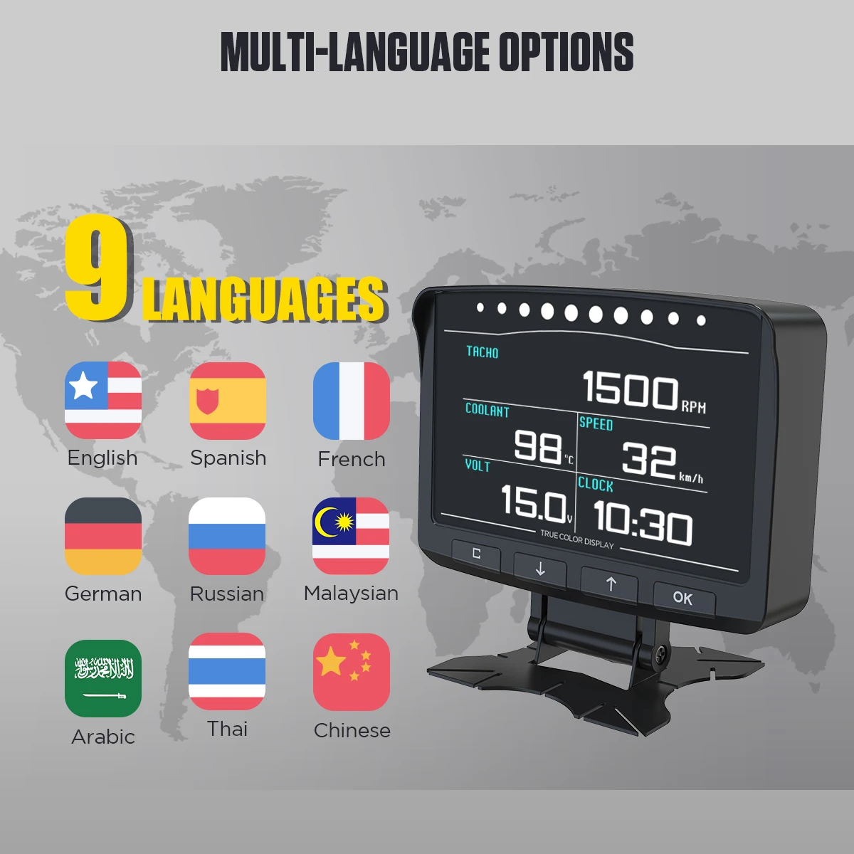 X50 PRO OBD computer-это умный и мощный автомобильный счетчик. Он специально разработан для транспортного средства без спидометра, датчика температуры двигателя, масляного термометра, а также калибровочного и расходомера топлива.