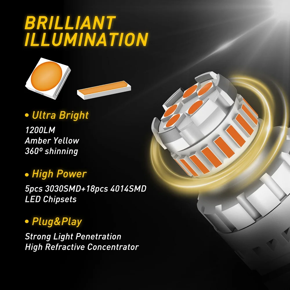 * Ультра яркий1200лм, Янтарный Желтый, 360 ° блестящий* Высокая мощность5 шт 3030SMD + 18 шт 4014 SMD* PLUG & PLAYСильный светильник для проникновенияКонцентратор высокой преломляемости