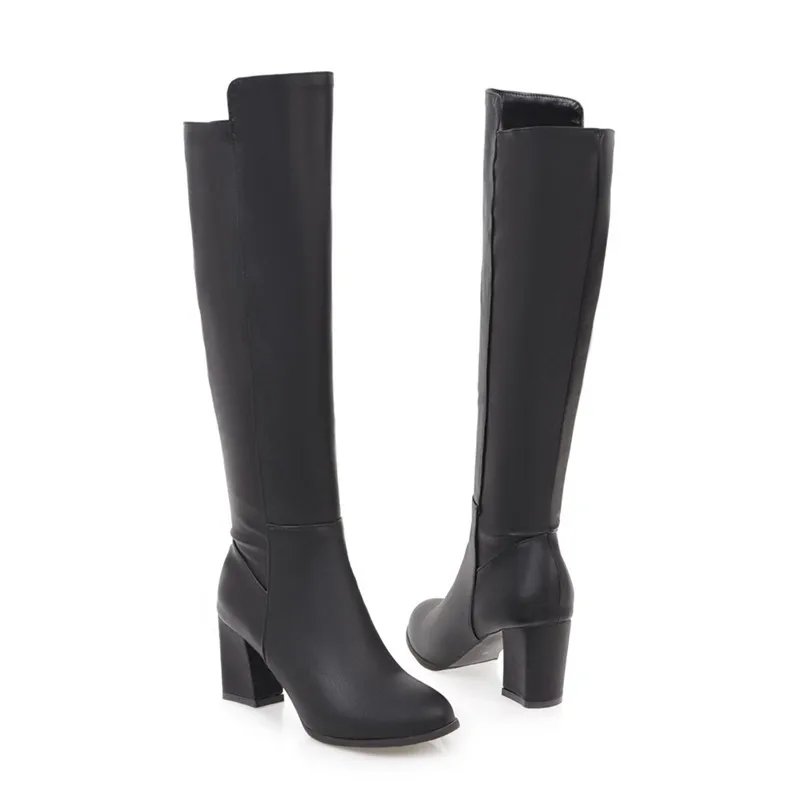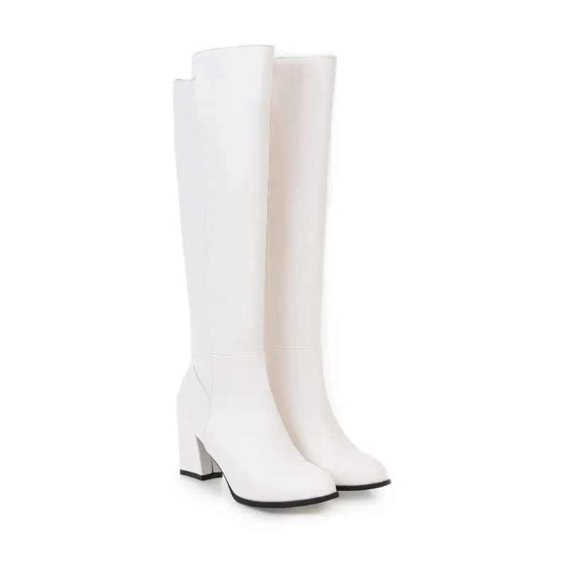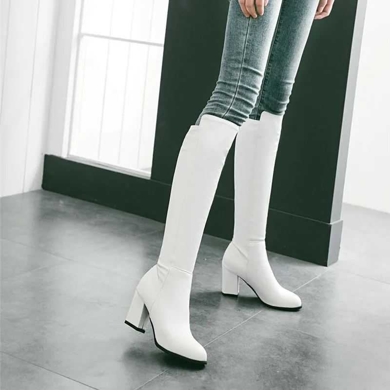 Модные белые черные эластичные сапоги до колена YMECHIC из искусственной кожи на высоком блочном каблуке Женская осенне-зимняя обувь 2022 элегантные длинные сапоги