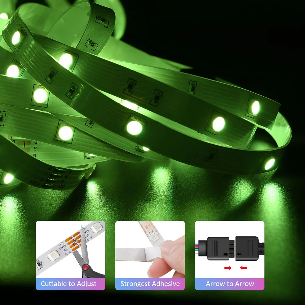 Лента прикольная, доставка очень быстрая, при подключении не возникло никаких проблем, управляется как с пульта так и с iphona,С обратной стороны присутствуют двухсторонний скотч, описанию соответствует, товар и продавца рекомендую!