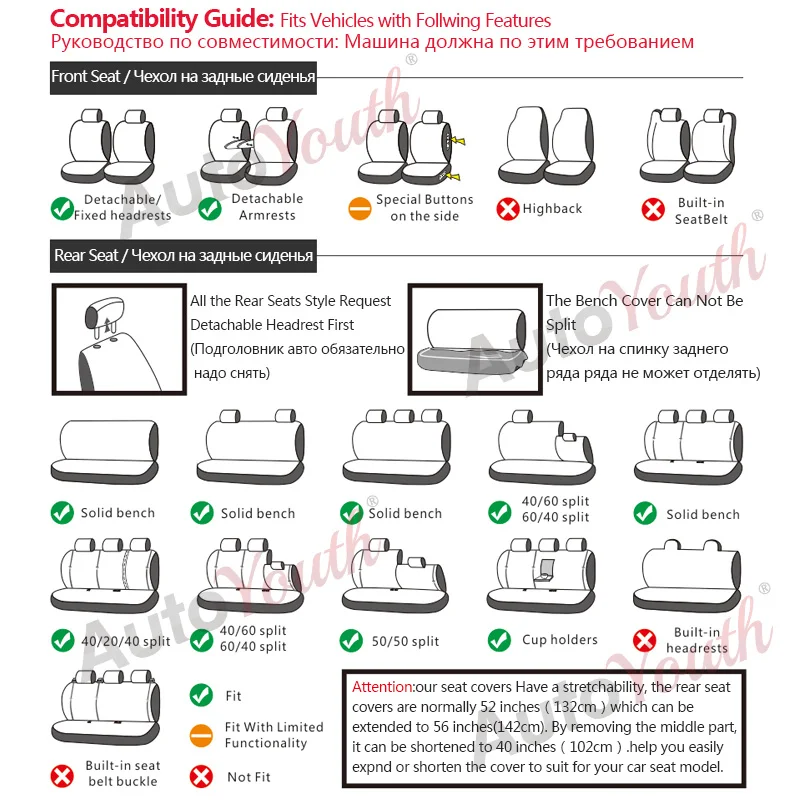 Внимание:Наши чехлы на сиденья отличаются растяжимостью, как правило, чехлы на задние сиденья имеют размер 52 дюйма (132 см) и могут быть увеличены до 56 дюймов (142 см). Удалив среднюю часть, его можно укоротить до 40 дюймов (102 см). Поможет вам легко снять или укоротить чехол под модель вашего автомобильного кресла.