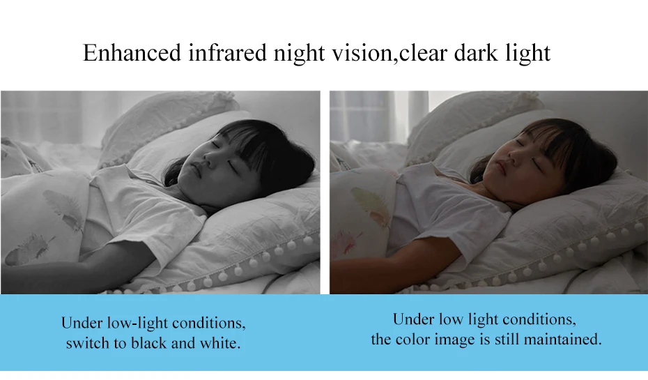 Встроенный инфракрасный заполняющий светильник 940nm, без красной экспозиции в ночное время, давая членам семьи опыт сна с высокочувствительным датчиком изображения, он также представляет цветные изображения при условиях низкого светильник