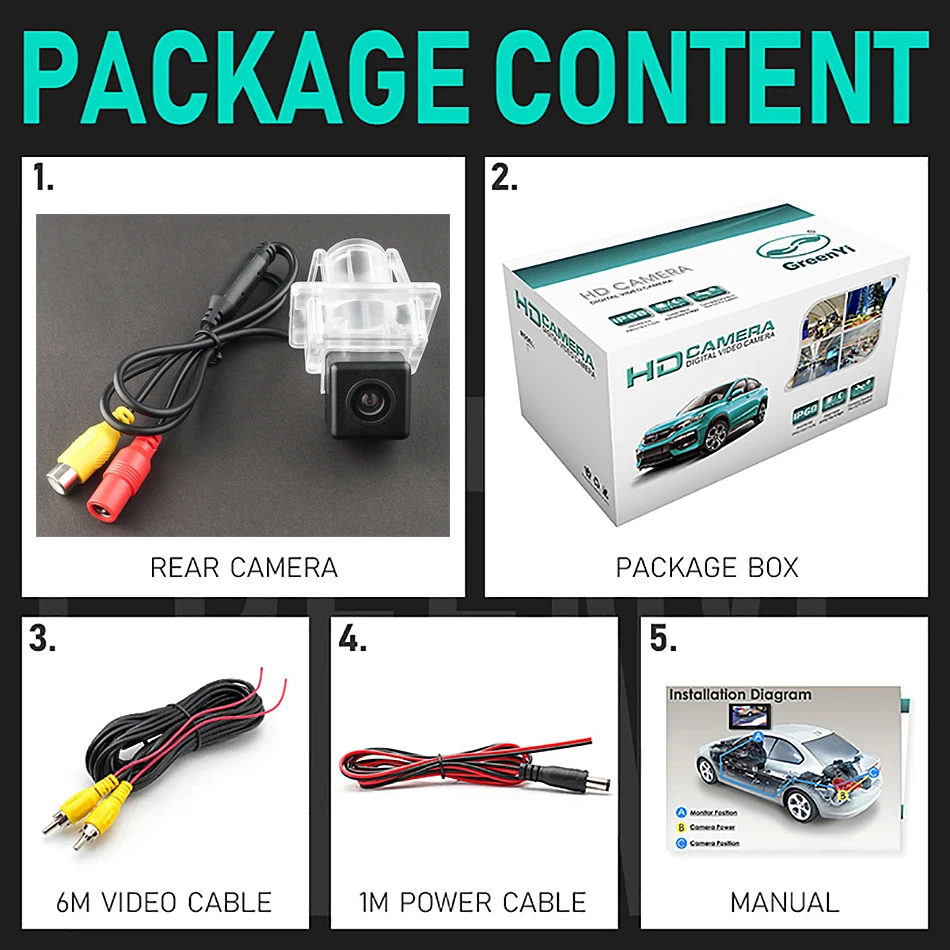 1. Камера траектории заднего вида2. Саморезы и коробка3. Видео кабель 6 м4. Кабель питания5. Руководство пользователя