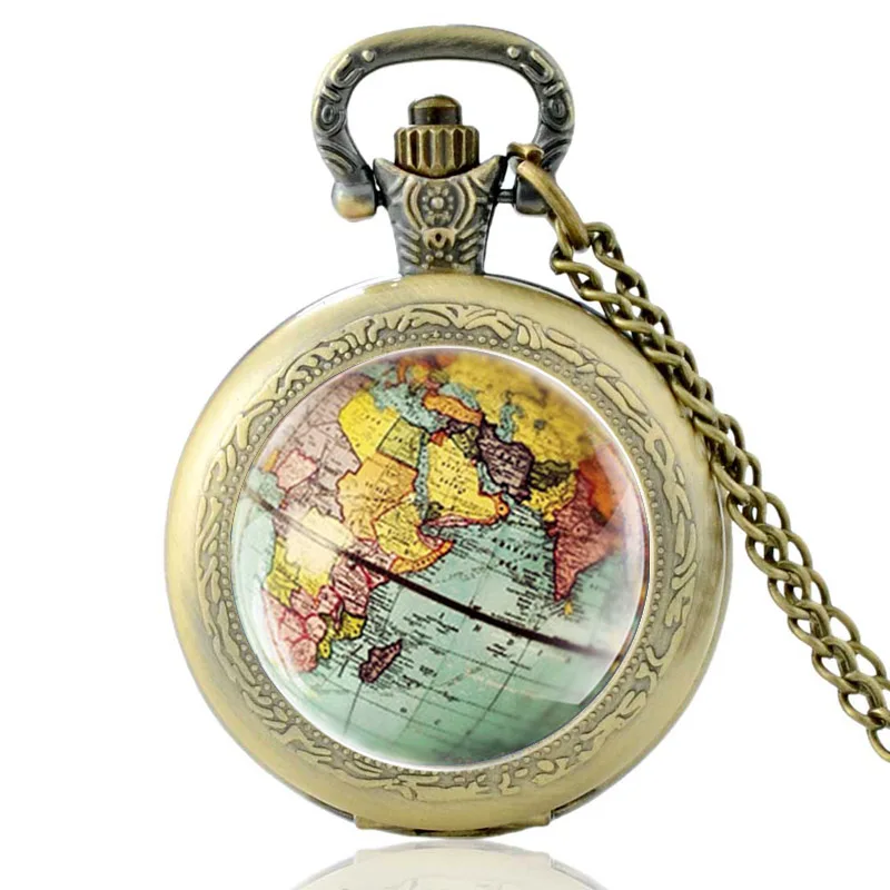 Часы наручные кварцевые для мужчин и женщин, винтажные карманные, с подвеской в виде карты мира, кабошона, цепочка с цепочкой и часовым поясом