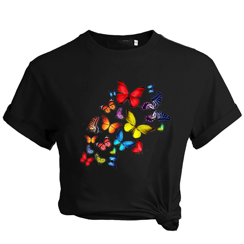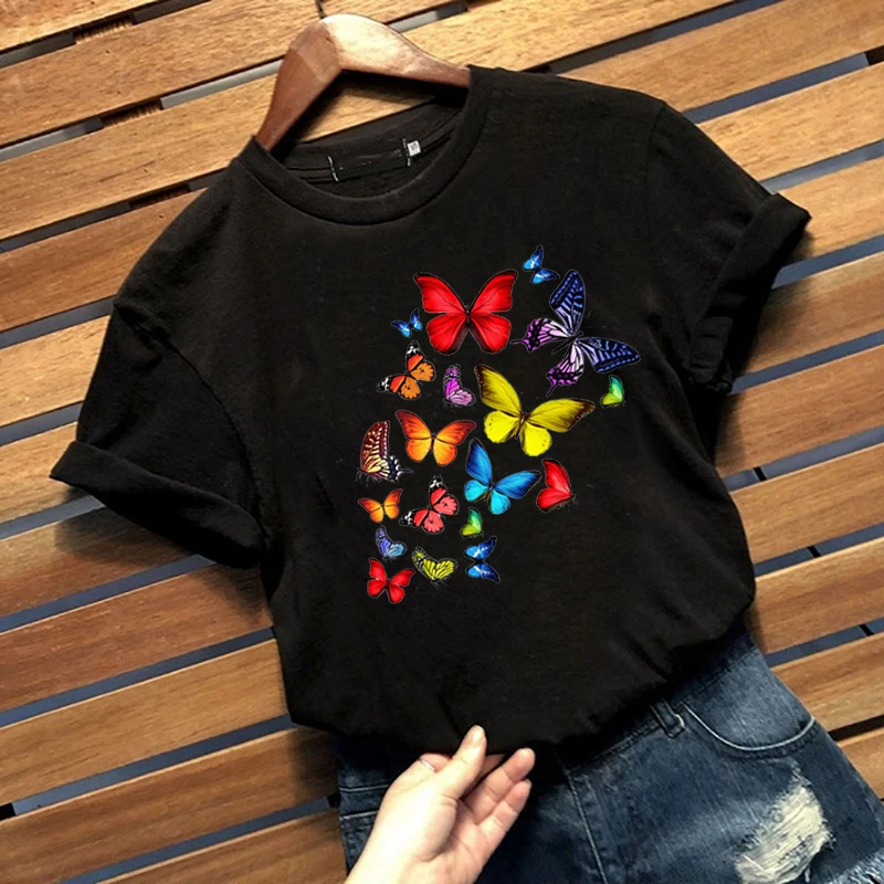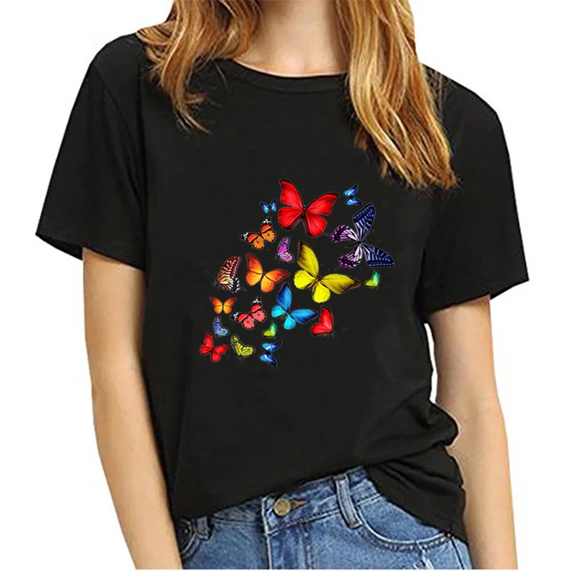 Новинка, Повседневная футболка с цветочным принтом и бабочками, женская футболка большого размера, топы с коротким рукавом, Vogue, летняя футболка, Женская свободная футболка в стиле Харадзюку