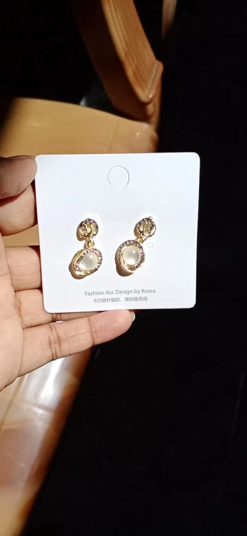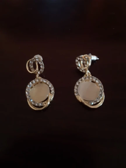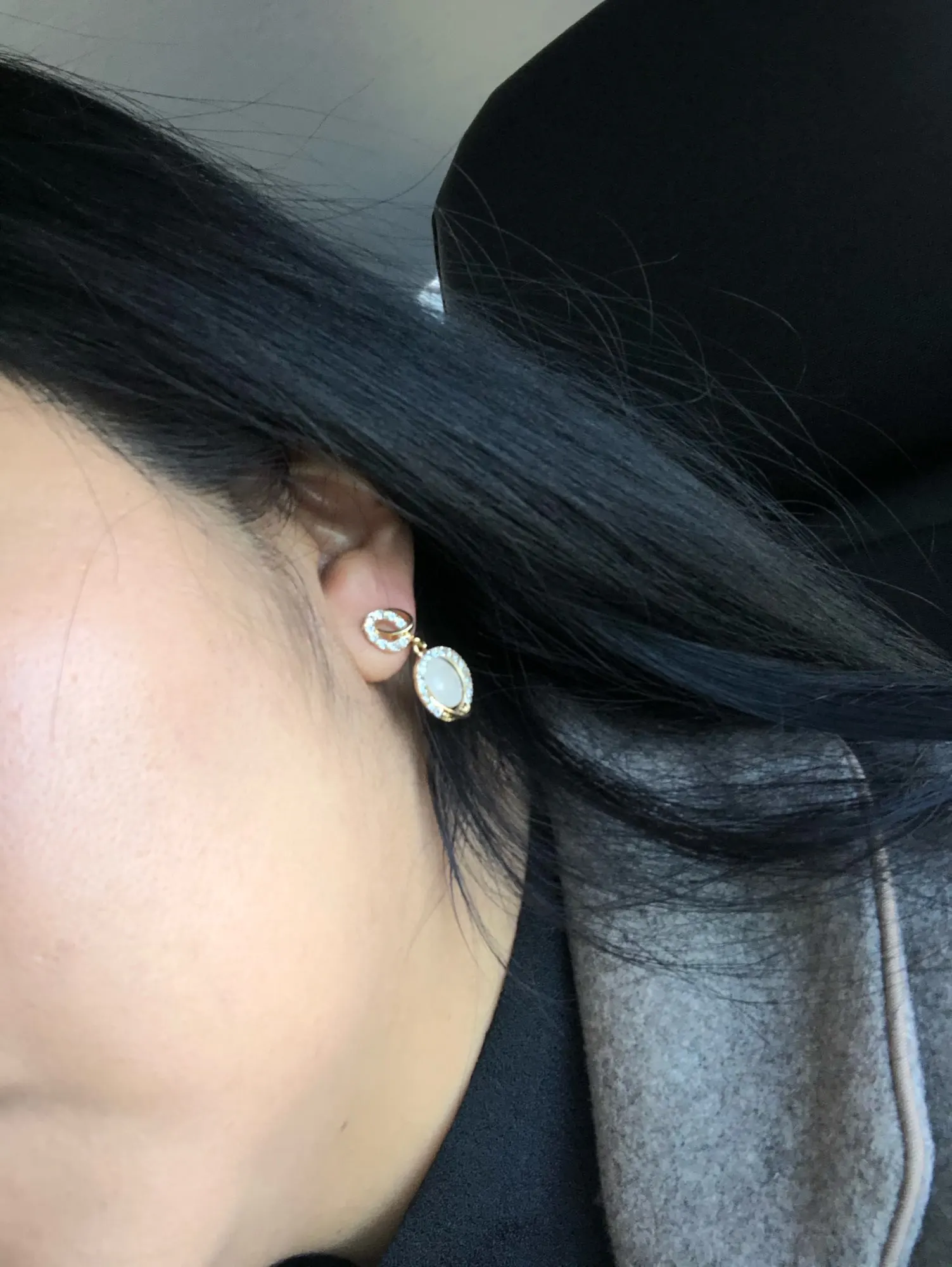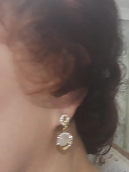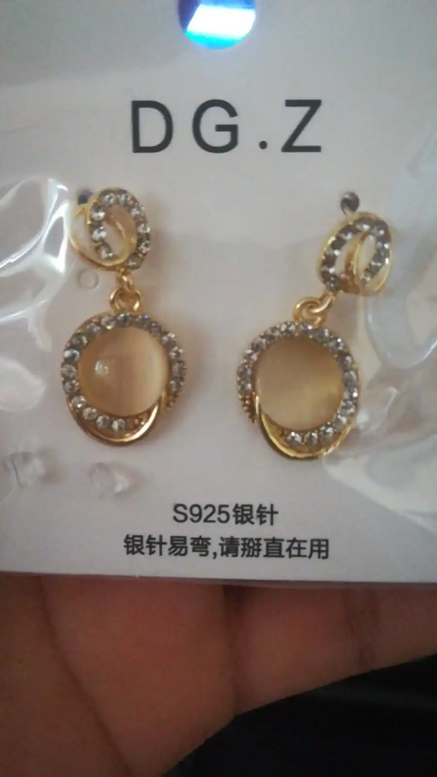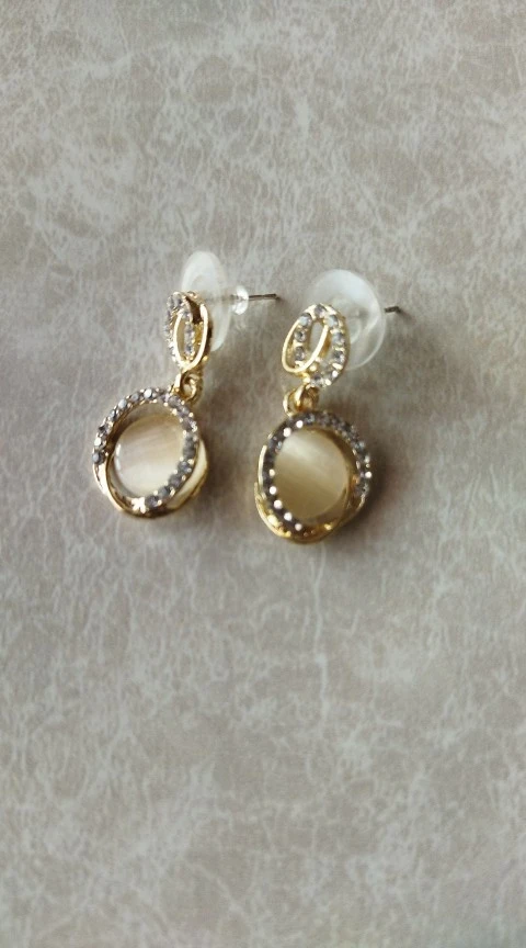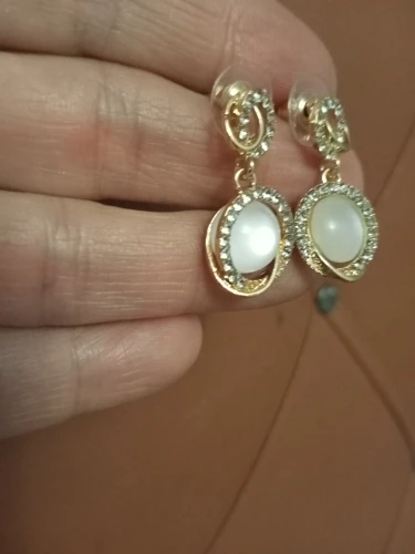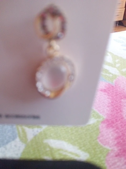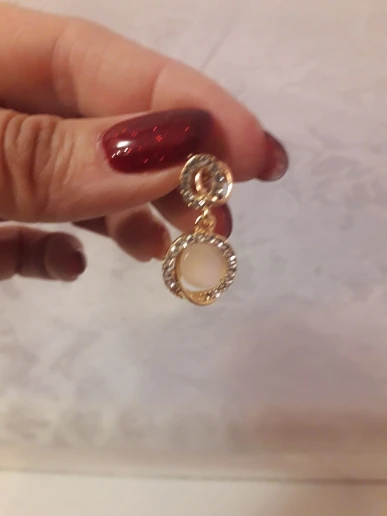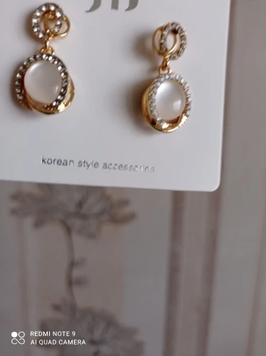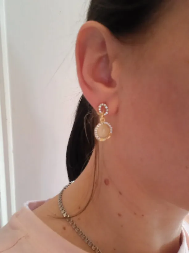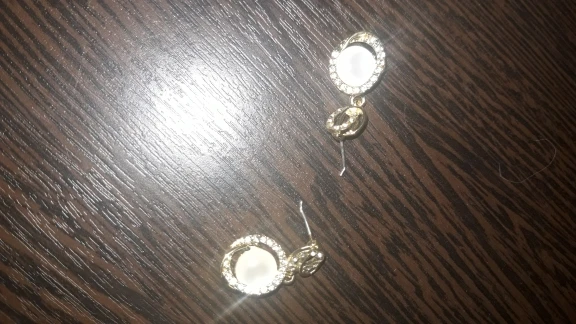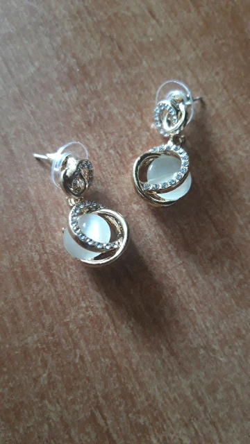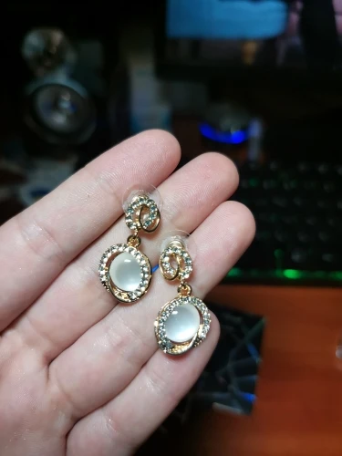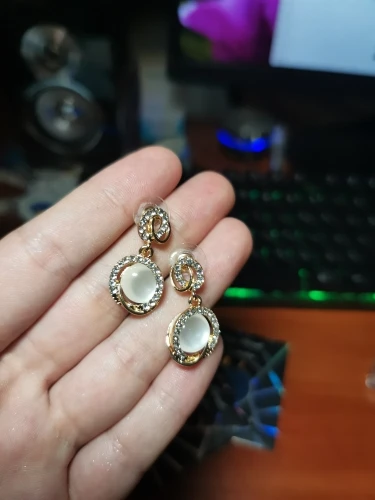 очень нежные, симпатичные сережки. красивая эмитация лунного камня, стразики яркие, закреплены хорошо. посмотрю как будут в носке