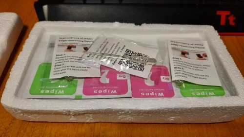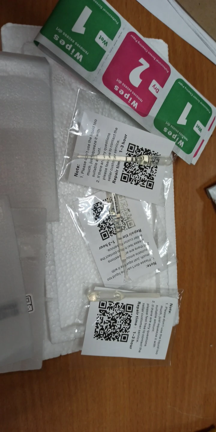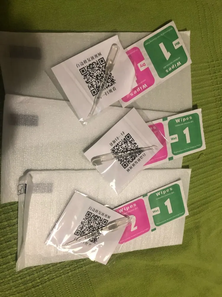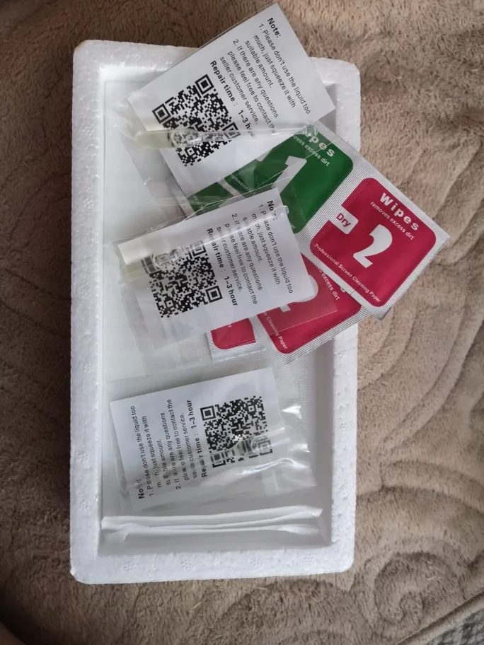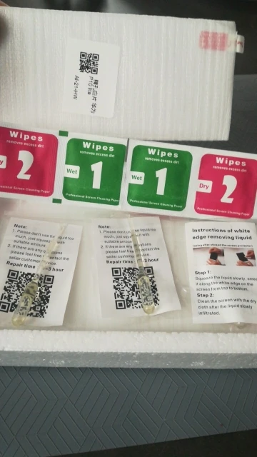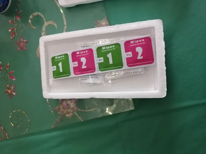 Очень хороший продукт, он поставляется с двумя салфетками и жидкостью для краев, я не пробовал очень доволен