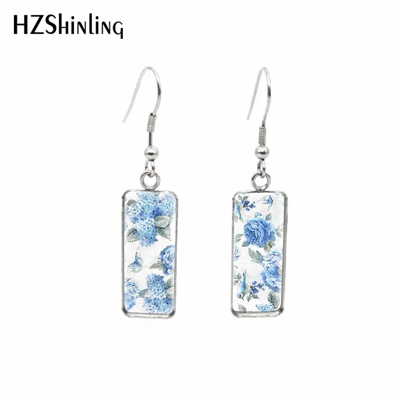 Серьги-крючки, с натуральными синими цветами, прямоугольные, с цвет...