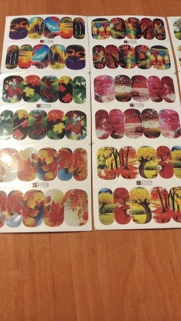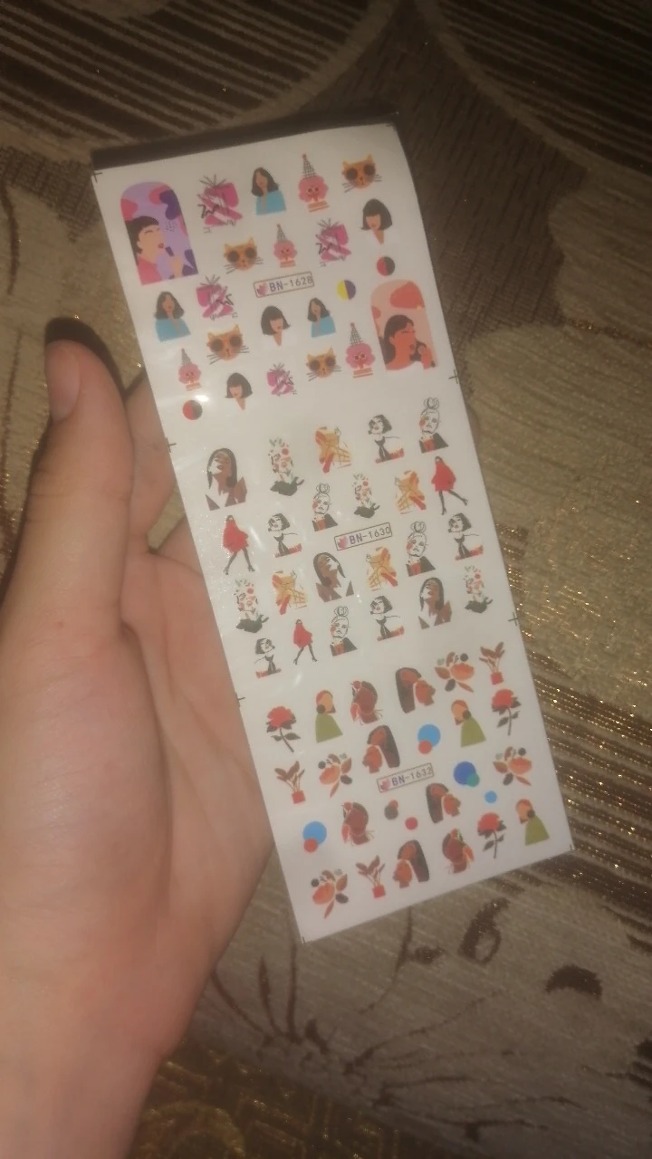 Невероятно красивые, насыщенные, оригинальные и качественные наклейки. Соответствуют фотке продавца. Поэтому я по приколу сфоткала на макролинзу парочку наклеек. Довольно широкие. точно больше стандартных ногтей, но с этим можно много чего придумать. Так что безусловно советую и точно буду покупать ещё! Продавцу спасибо за подарок.