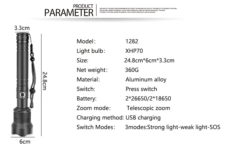 Мощный светодиодный фонарик с использованием лампы XHP70.2 светодиодный фонарик с максимальной мощностью до 7000 люменовУвеличьте 2*18650 или 2*26650 аккумуляторный отсек, чтобы увеличить время работы.Дисплей емкости аккумулятора, телескопический зумМикро-usb для компьютера usb, Автомобильный USB, usb-разъем для зарядки, зарядный фонарикИзготовлен из авиационного алюминиевого сплава прочный HAIII военный класс Жесткий анодированныйВодонепроницаемый в соответствии с IPX-6, водостойкий, может использоваться в дождливую погоду, но не может положить его в водуПодходит для работы, охоты, альпинизма, рыбалки, кемпинга и активного отдыха и т. д.Ударопрочный до 2 метров
