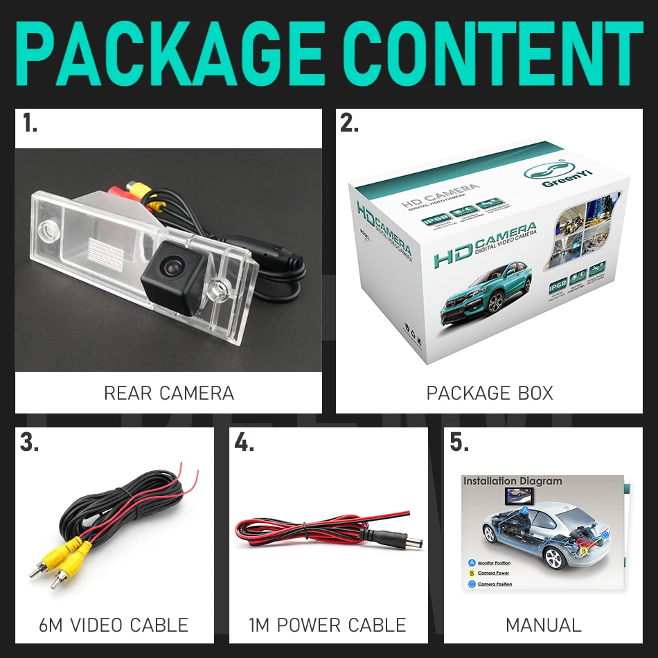 1. Камера траектории заднего вида2. Саморезы и коробка3. Видео кабель 6 м4. Кабель питания5. Руководство пользователя