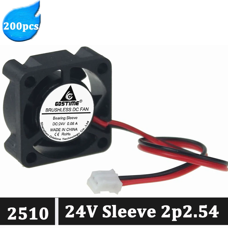 200 шт. Gdstime мини Бесщеточный вентилятор охлаждения постоянного тока 25x25x10 мм 2510 24В 25 мм 2pin