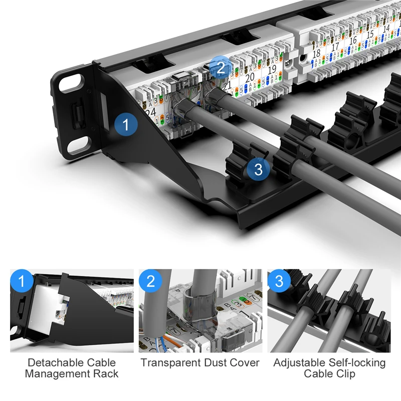 Двойной IDC 110 или krone удар вниз конец. Подходит для универсальных 19 "стоек, шкафов или настенных кронштейнов. Съемная конструкция в опорной панели для управления кабелем и пусковые блоки расширили практичность коммутационной панели
