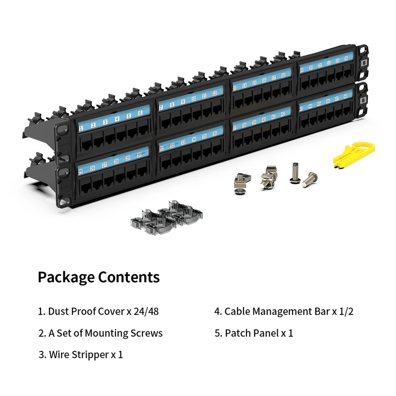 CAT6 патч-панель: принимает 22-28 AWG Cat6/ Cat5e/ Cat5 твердый и многожильный сетевой кабель UTP; CAT5e патч-панель принимает 22-26 AWG Cat5e/ Cat5 твердый и многожильный сетевой кабель UTP
