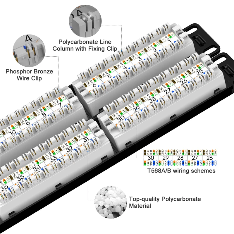 В соответствии с промышленными спецификациями TIA/EIA 568, а также с схемой подключения T568A/B, эта коммутационная панель увеличивает производительность сети и может идти в ногу с растущими переменами в сети