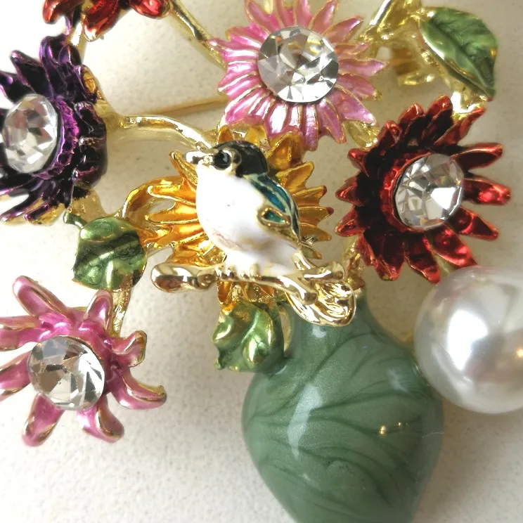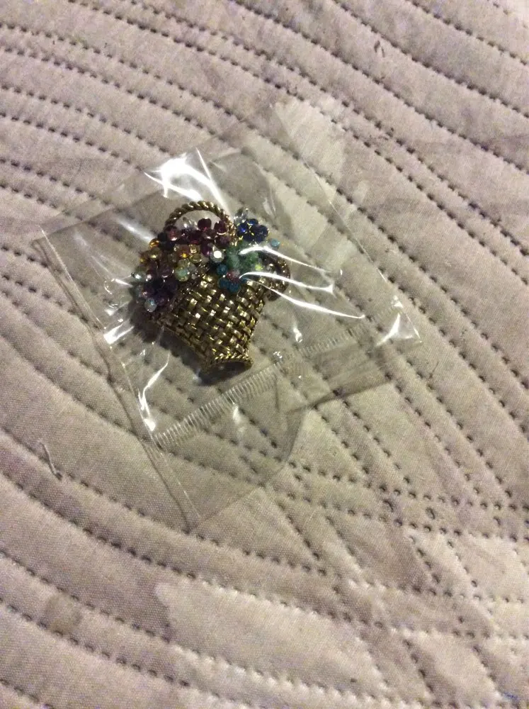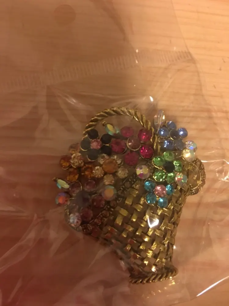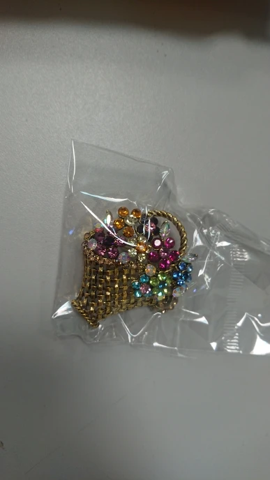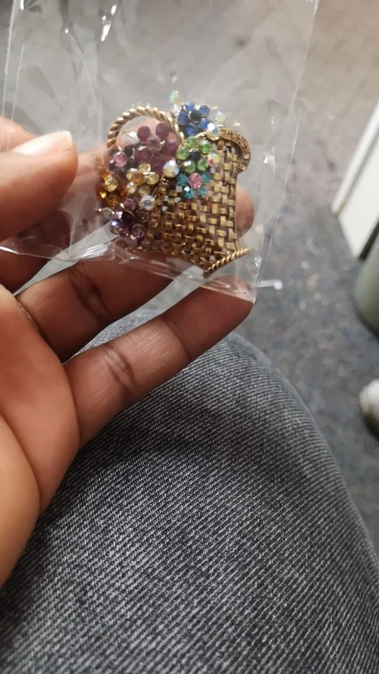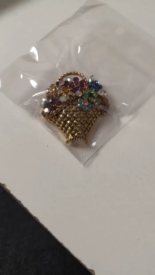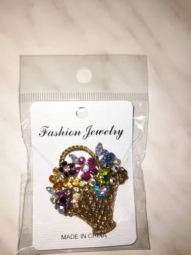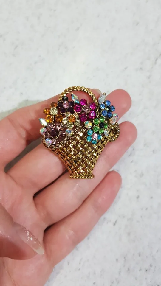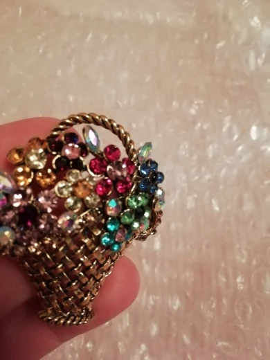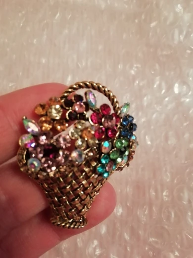 Шик, блеск, красота! Много блеска, камней в букете цветов. Шикарная корзина с цветами в образе винтажной брошки. Очень красиво смотрится, по качеству тоже нормально, замочек с фиксатором, камушки закреплены хорошо. Один восторг!!! Размер 4,5х4 см, брошка увесистая. Ну, очень красивая брошка!