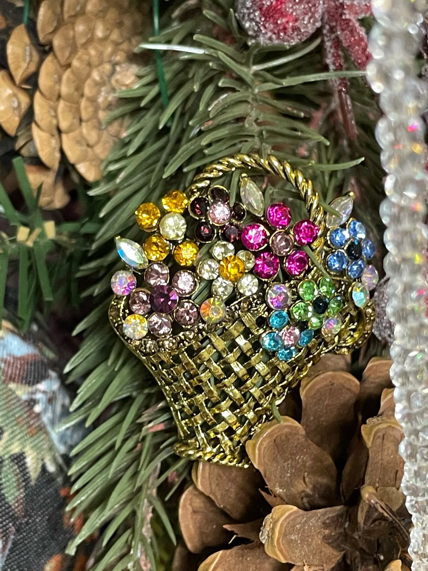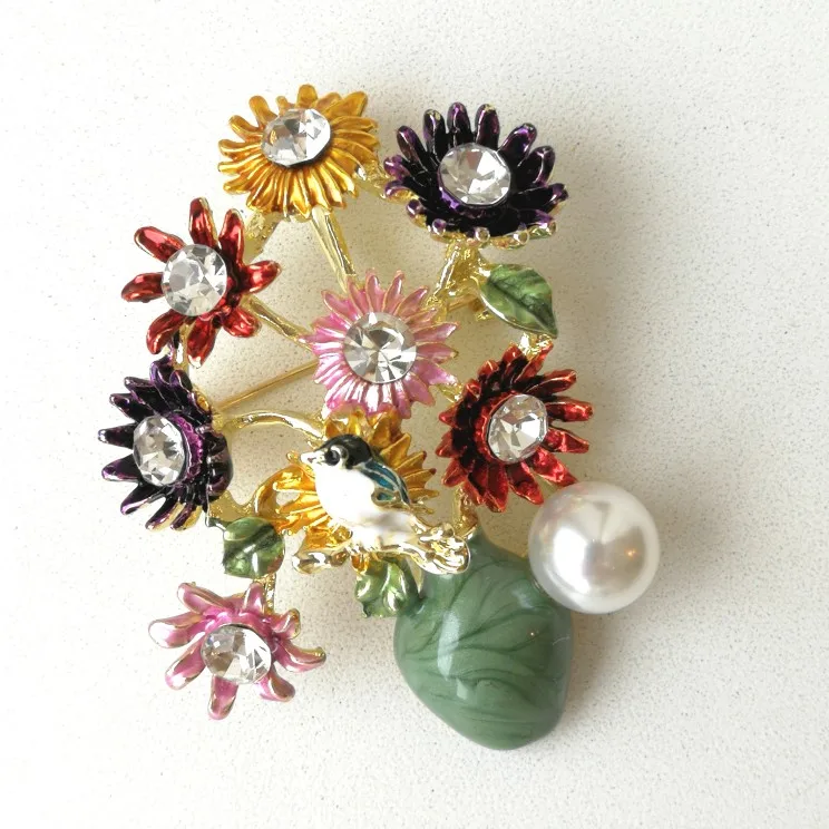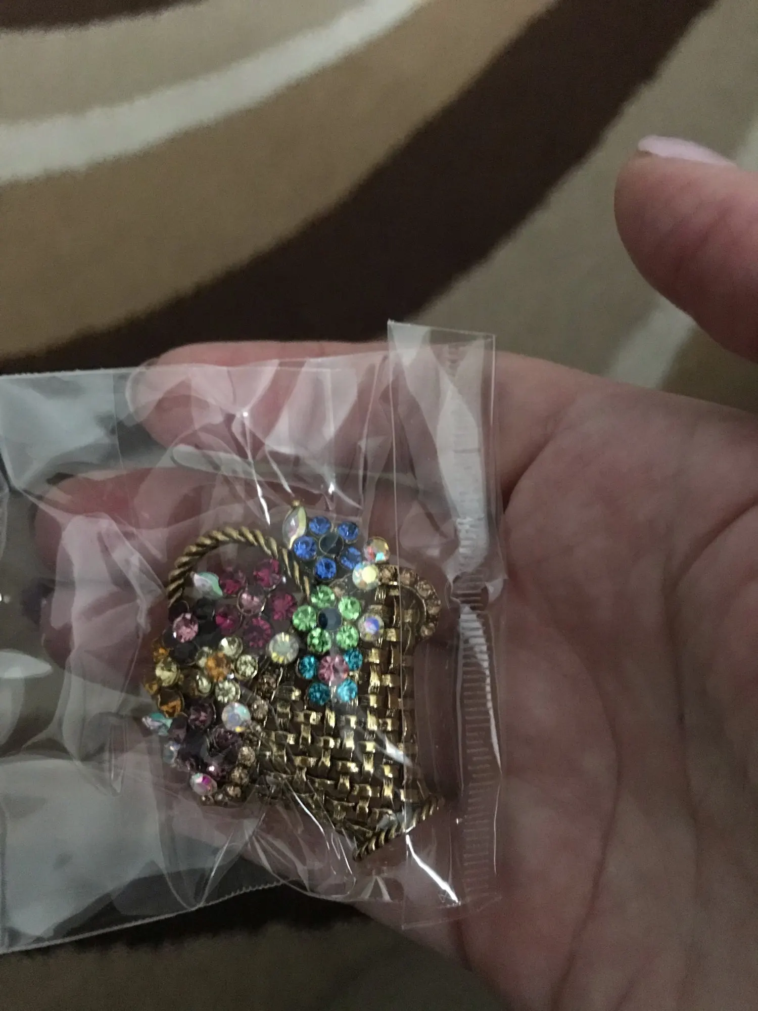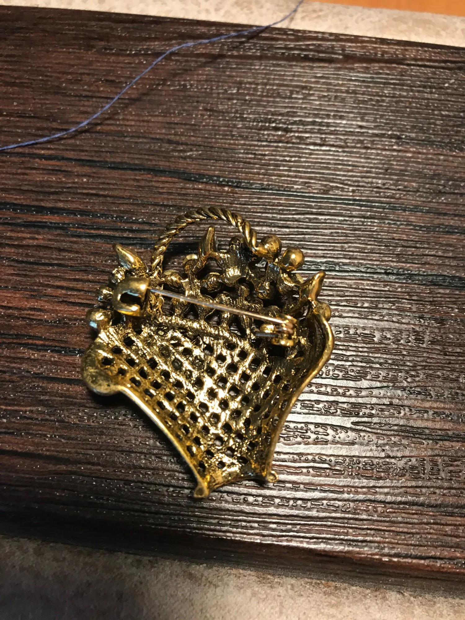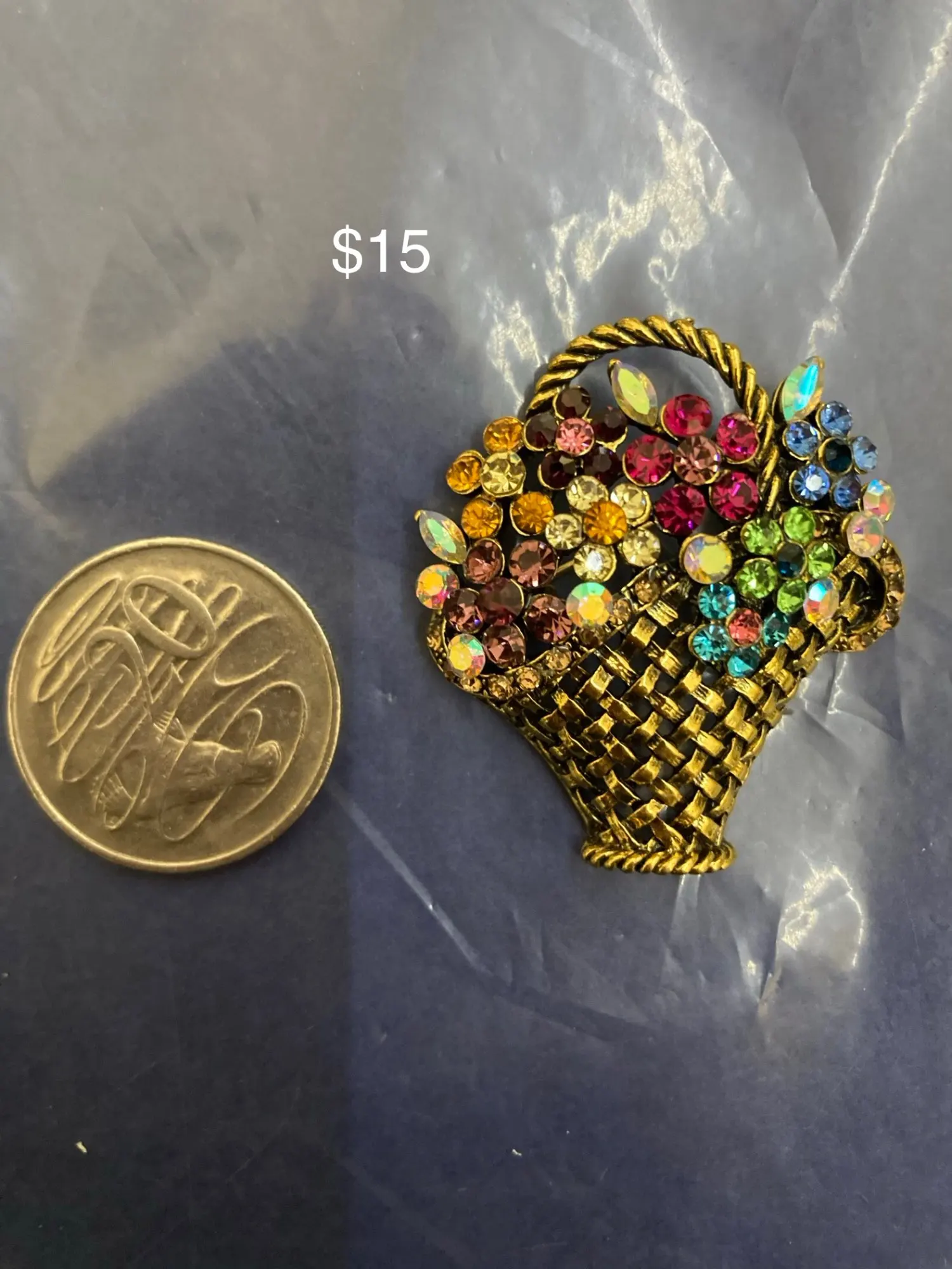 Шик, блеск, красота! Много блеска, камней в букете цветов. Шикарная корзина с цветами в образе винтажной брошки. Очень красиво смотрится, по качеству тоже нормально, замочек с фиксатором, камушки закреплены хорошо. Один восторг!!! Размер 4,5х4 см, брошка увесистая. Ну, очень красивая брошка!