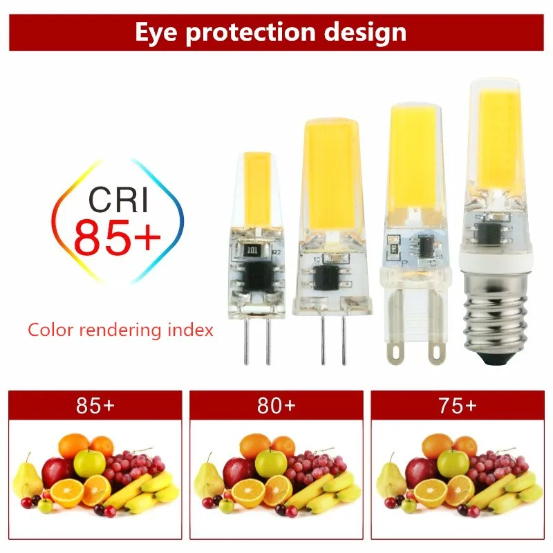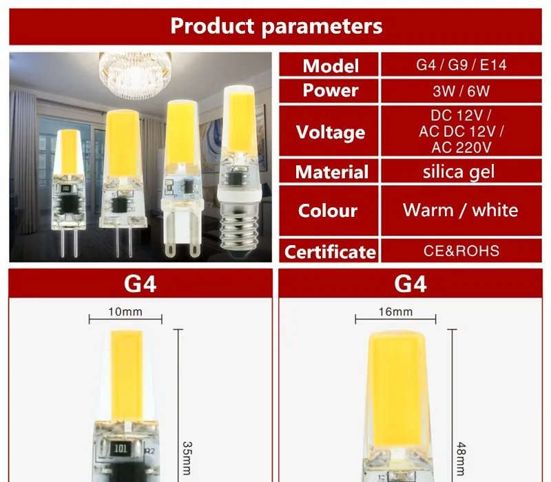 Тип цоколя: G4 / G9 / E14 Светодиодный чип-Модель: COB Напряжение: G4 : DC12V, AC/DC 12V или AC220-240V; G9 : AC220-240V; E14 : AC220-240V (Примечание: Перед покупкой проверьте нужное напряжение.) Цветовая температура: теплый белый: 2800-3200K; Холодный белый: 6000-6500K Гарантия: 2 года