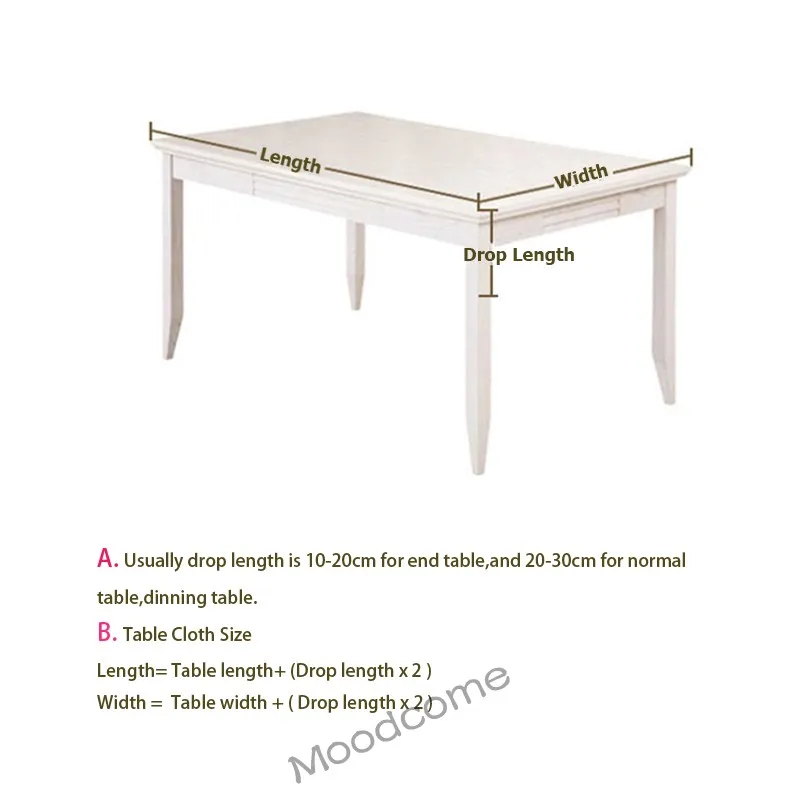 1. Размер скатерти. Обычно длина падения 20-30 см. Обычно длина стола + (40-60 см), ширина стола + (40-60 см)