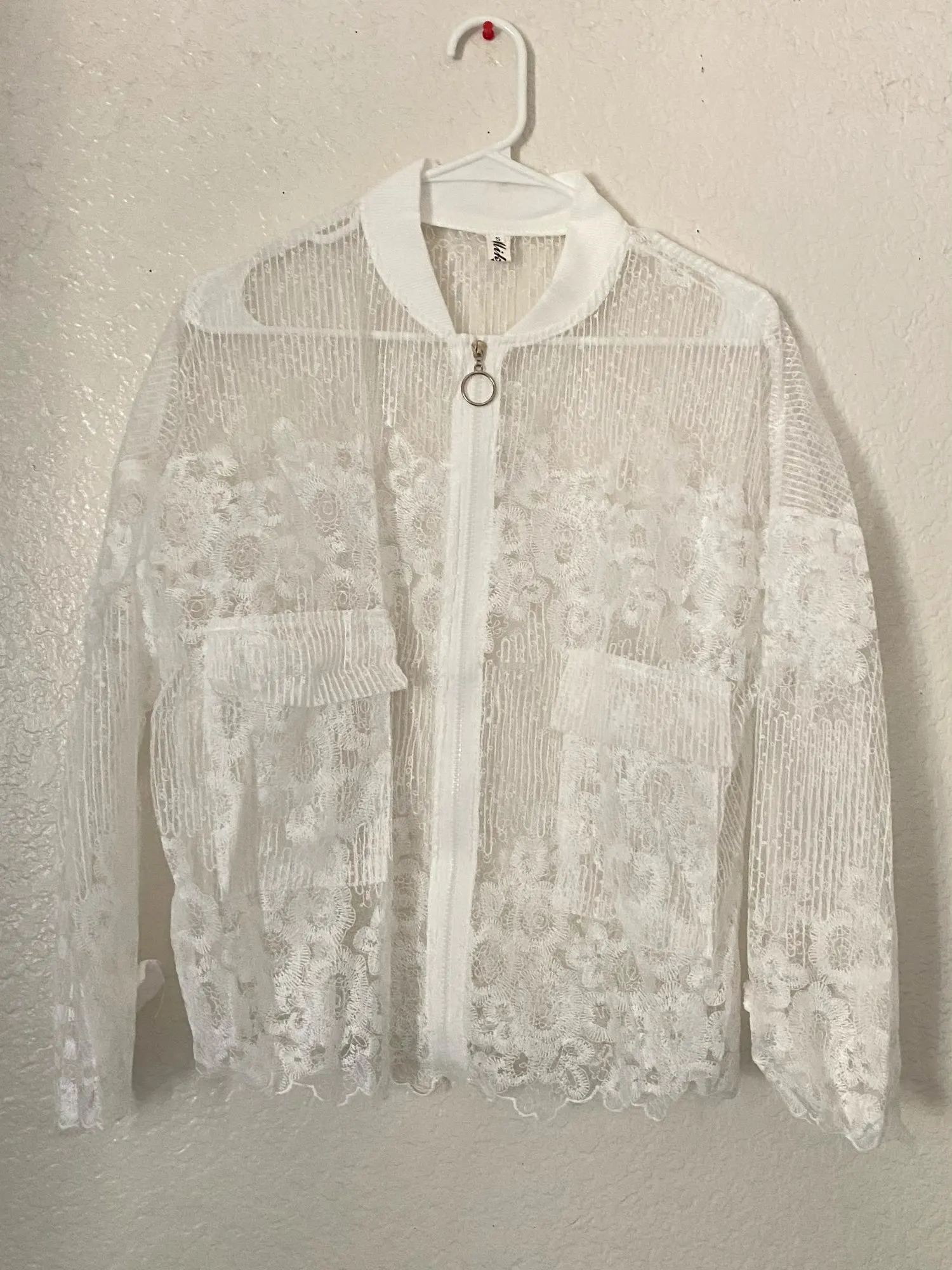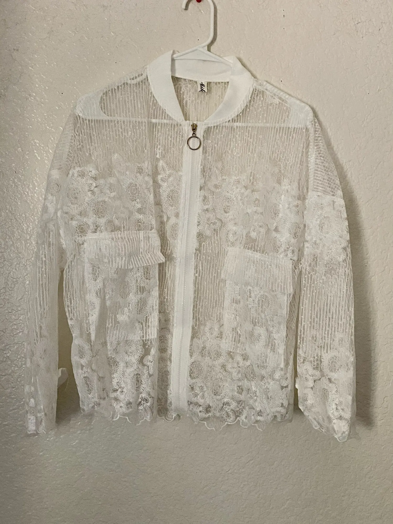 Очень красивая кружевная куртка. Кружево очень милое, очень милое. Выглядит так мило, но немного выглядит сексуально. Когда я надевал его, каждое тело давало мне хорошее дополнение, они сказали, что выглядит такой красивой курткой и делает меня такой молодой.