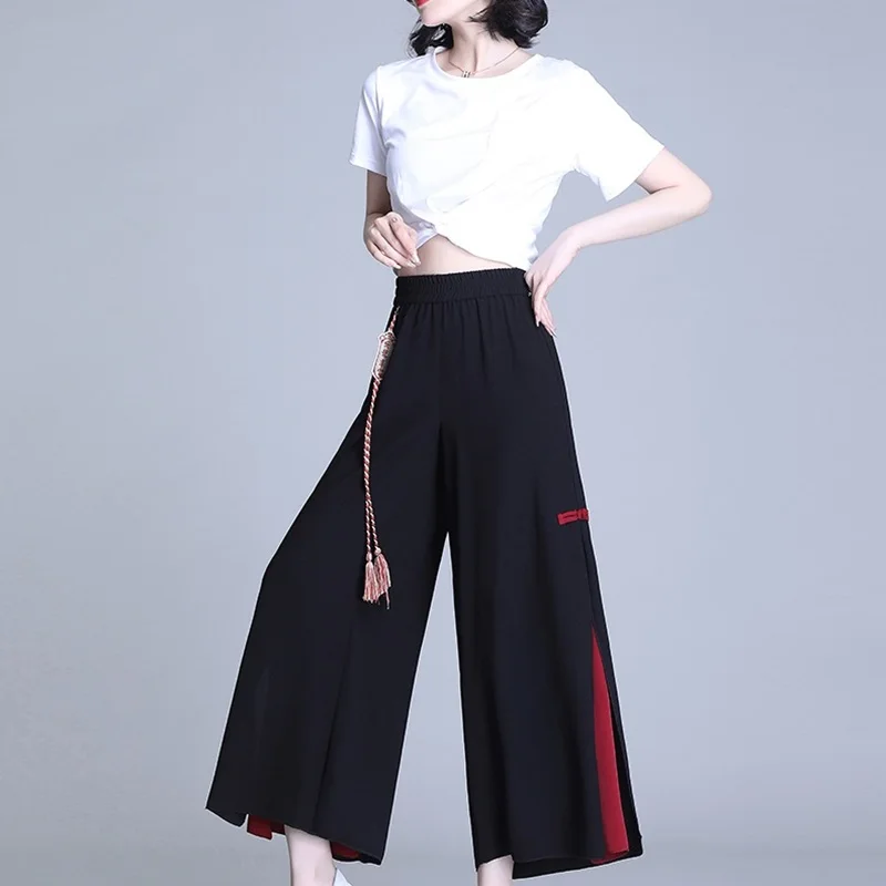 Женские укороченные брюки контрастных цветов, Свободные повседневные брюки из хлопка и льна в китайском стиле, 10504