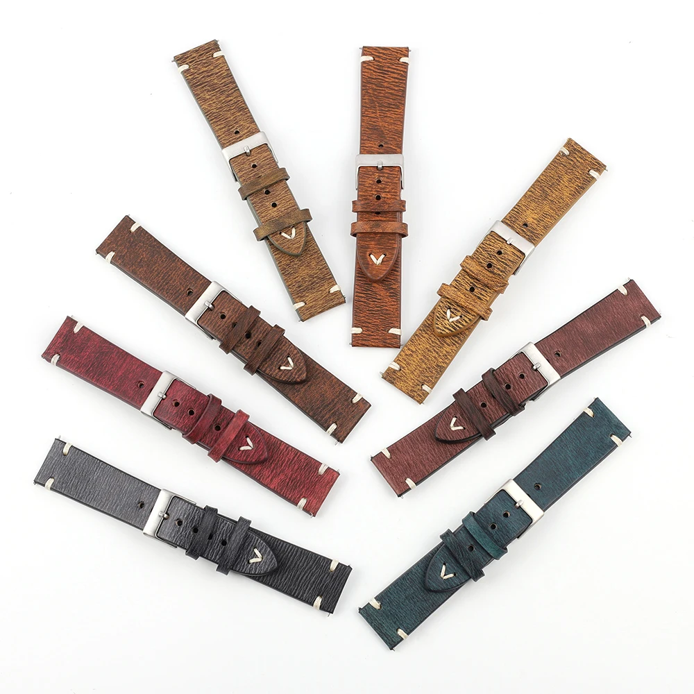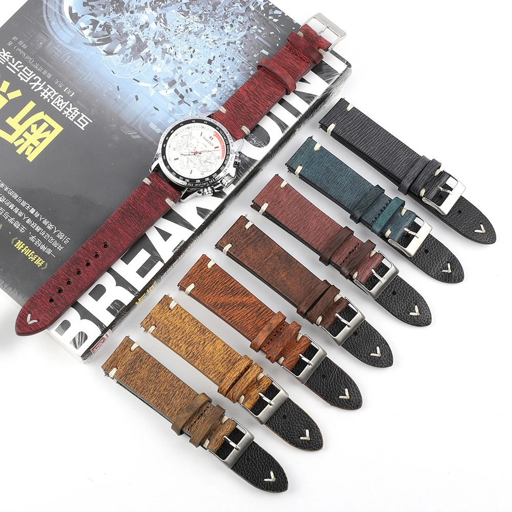 Винтажный кожаный ремешок для часов с ручной прошивкой, 18 мм, 20 мм, 22 мм, 24 мм, состаренный вид ремешок для часов, проблемный браслет из телячьей кожи