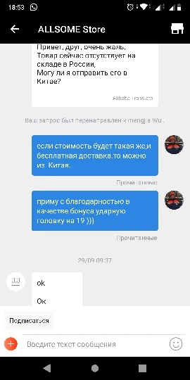 Товара не было в России, продавец попросил отсрочки,и отправки из Китая. согласился с условием на бонус к заказу, ударную,головку на 19. В итоге заказ пришёл с опозданием,и без обещанного бонуса.... мелочь но неприятно.... скриншот переписки прилагаю