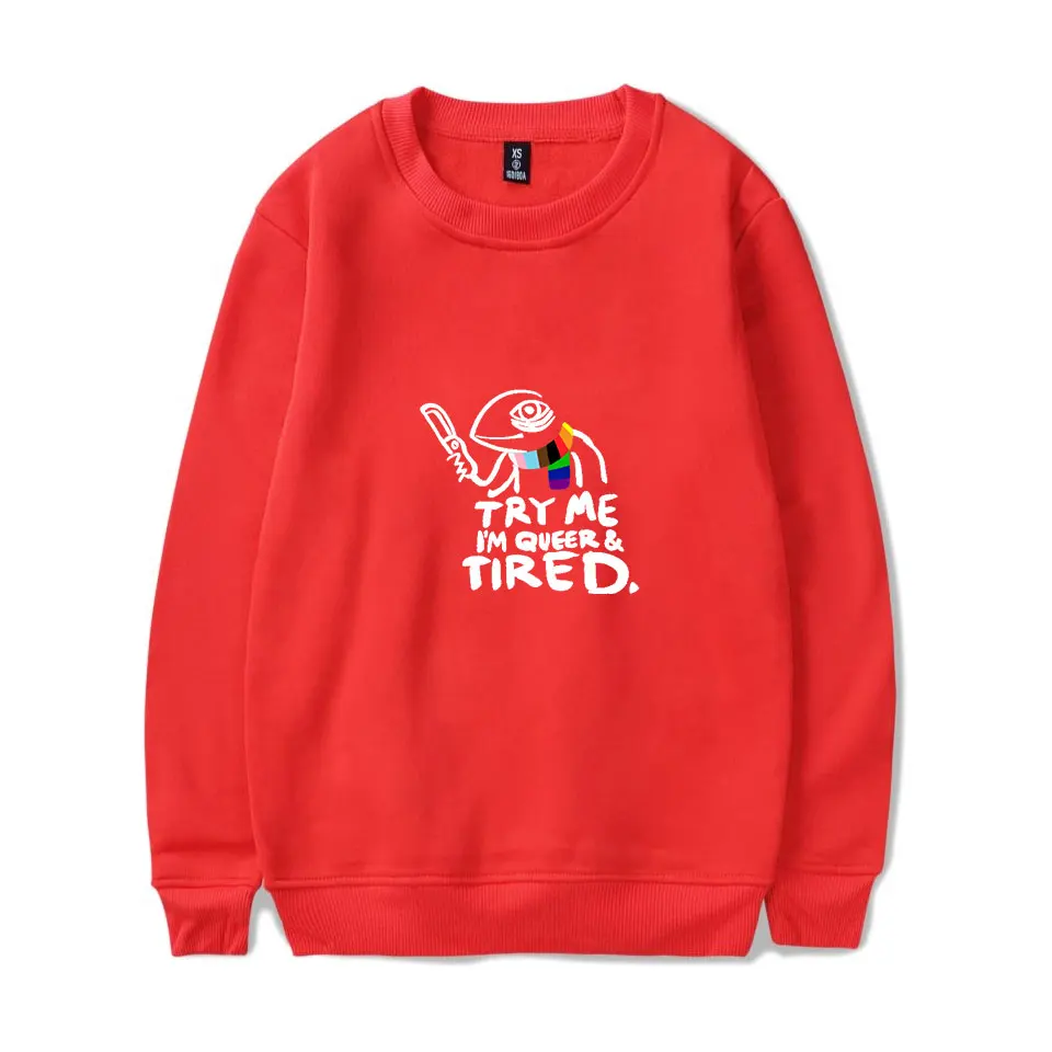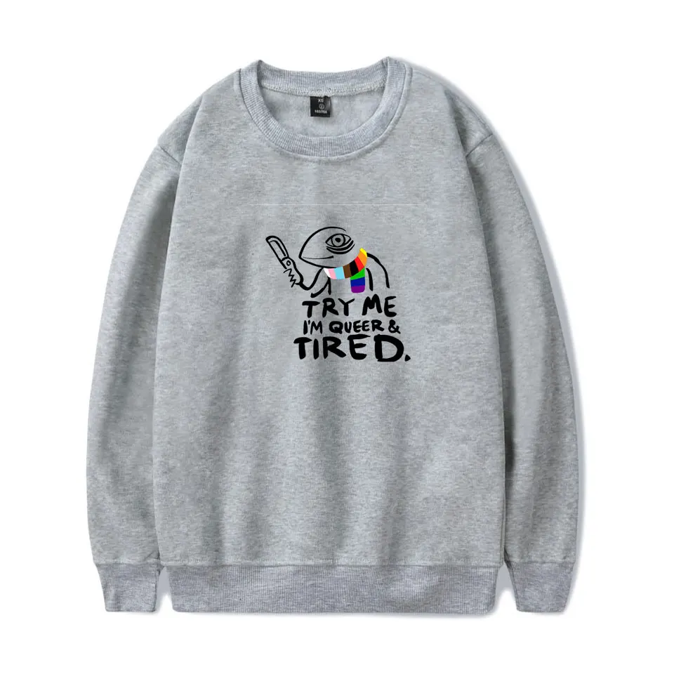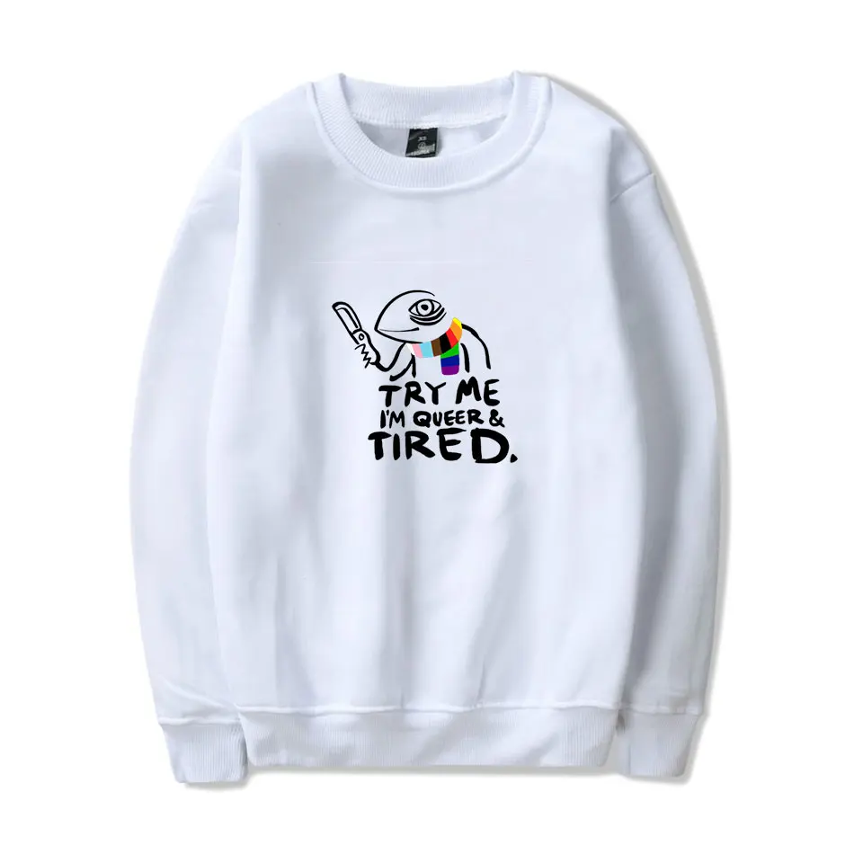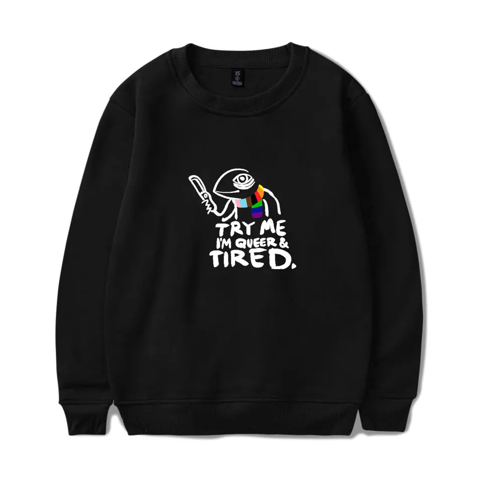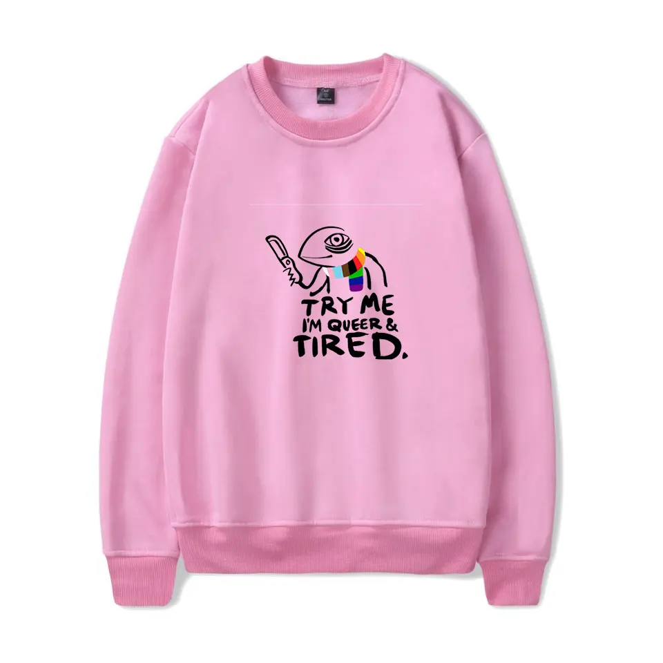 Попробуйте меня. Женскиймужской свитшот с принтом I'm Queer and уставшие, с круглым вырезом, теплая уличная одежда, толстовки 2020, Повседневная крутая трендовая одежда