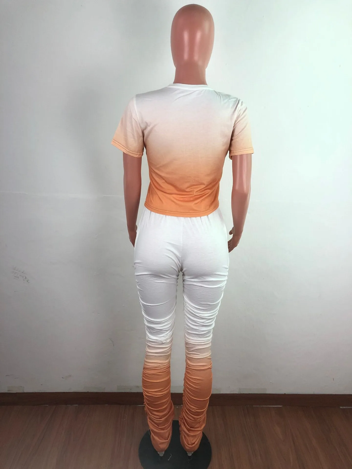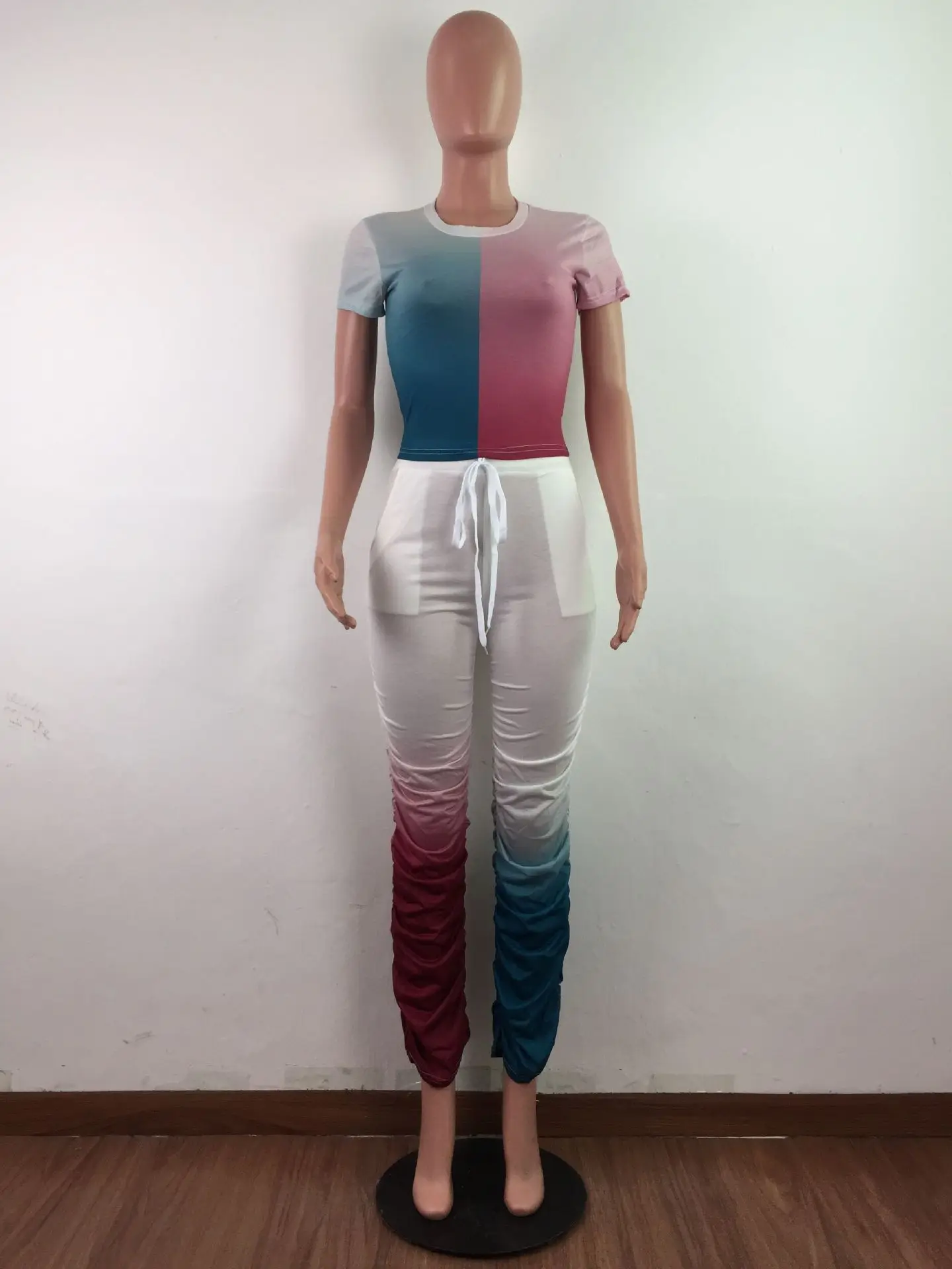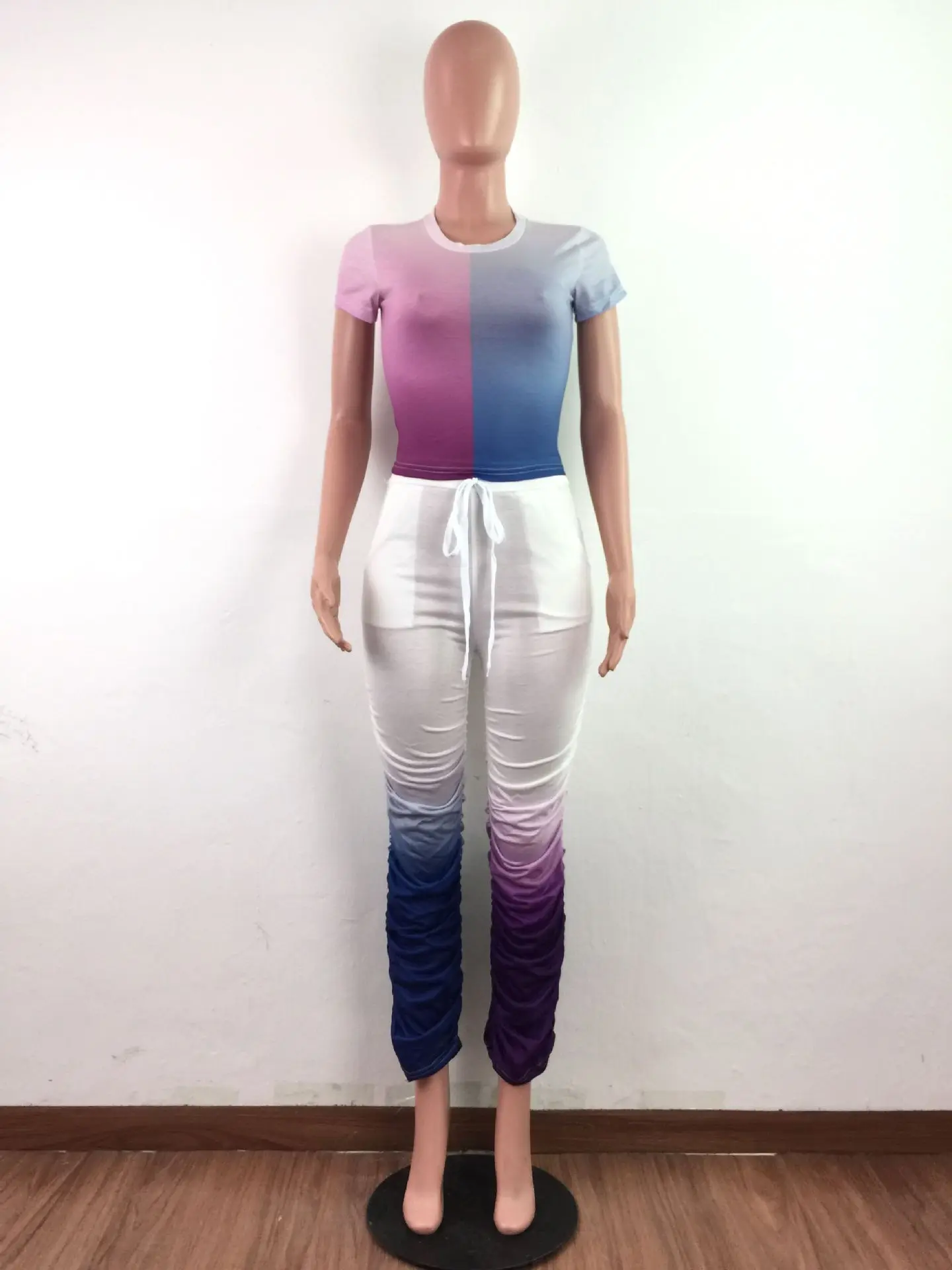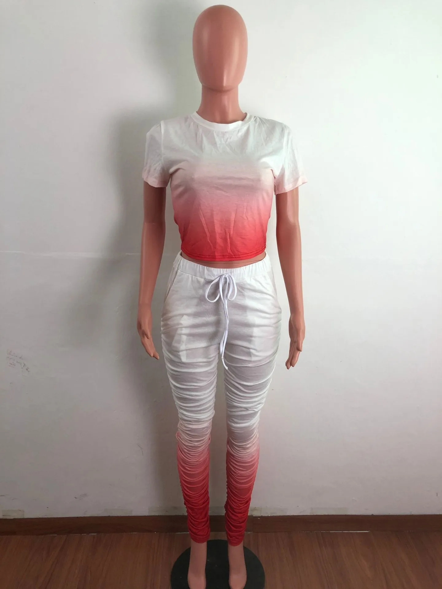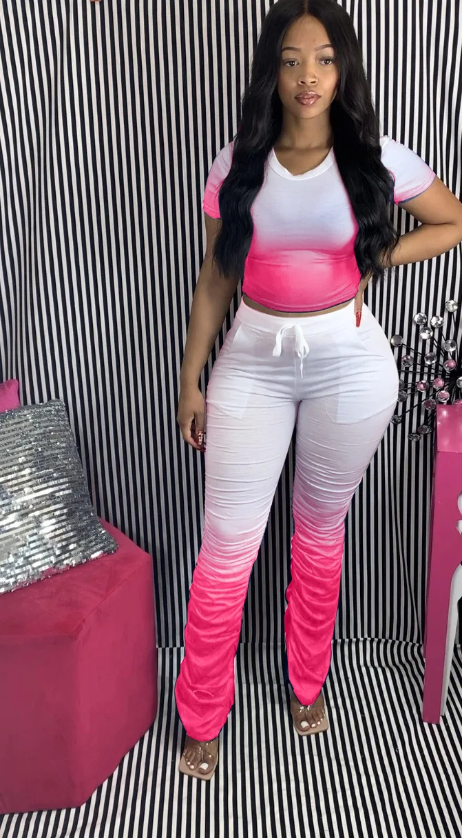 JRRY Для женщин костюмы Двойка комплект короткий рукав топ длинные расклешенные брюки Комплект из 2 предметов гофрированные спортивные костюмы с рисунком теплая одежда для улицы