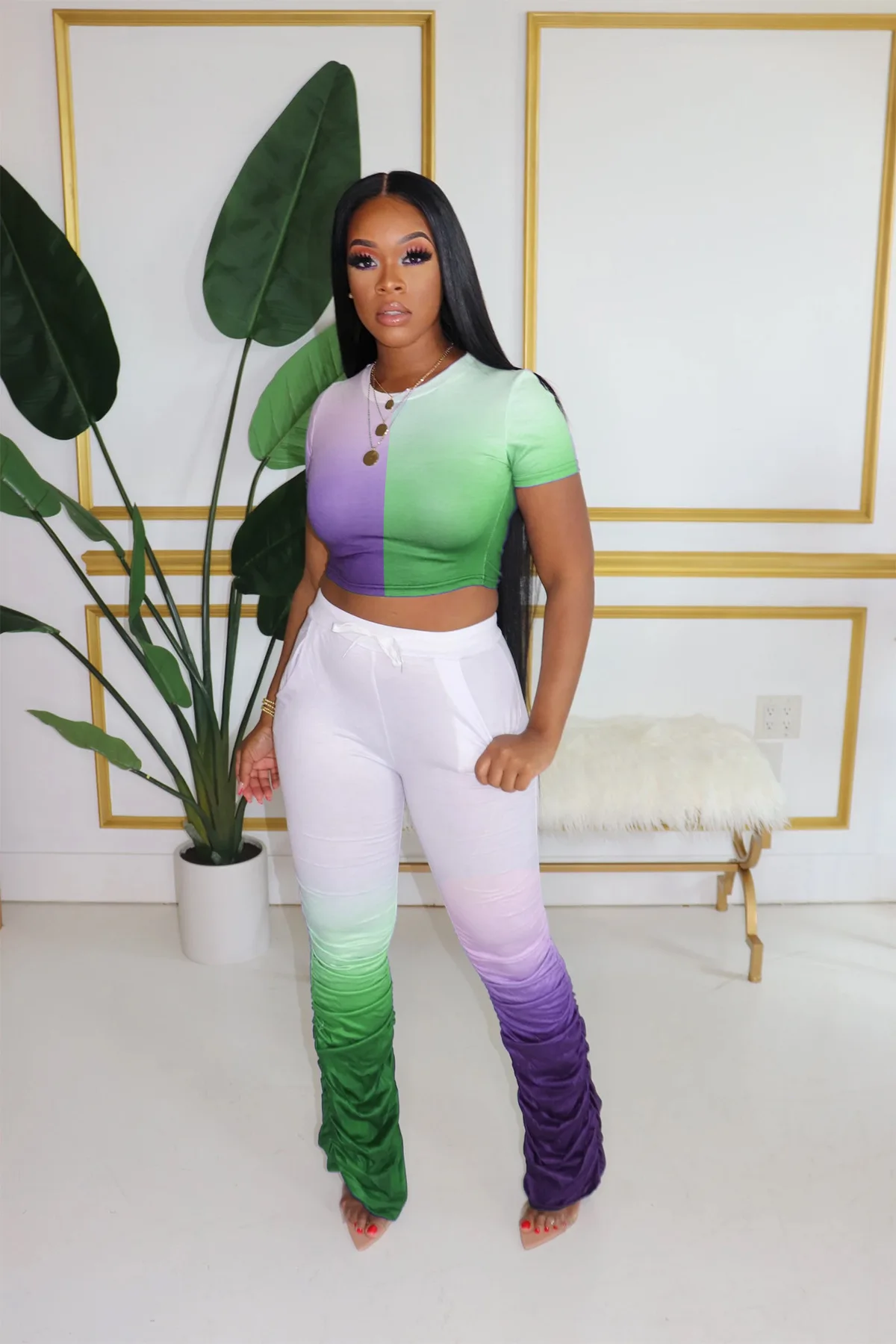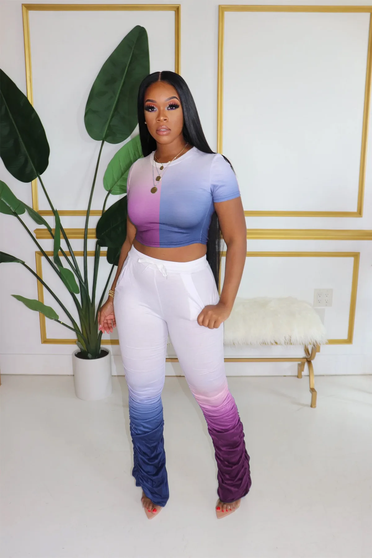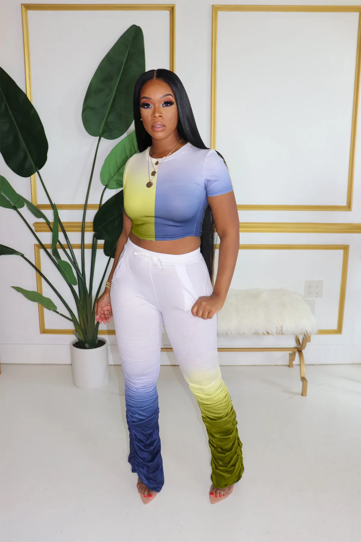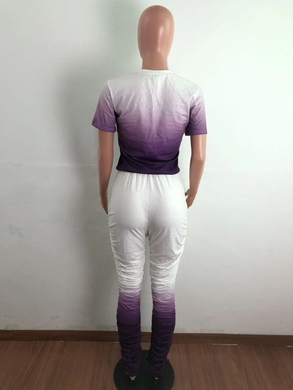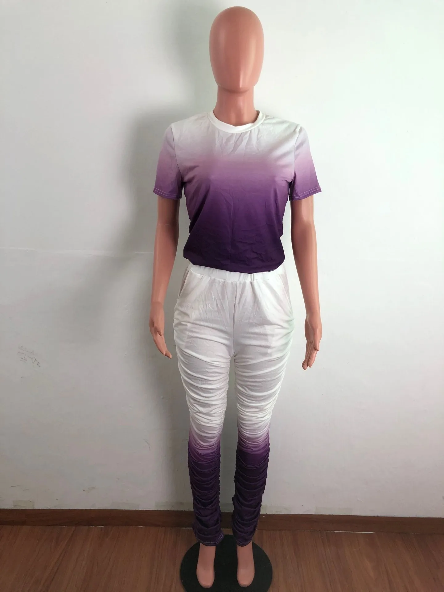 JRRY Для женщин костюмы Двойка комплект короткий рукав топ длинные расклешенные брюки Комплект из 2 предметов гофрированные спортивные костюмы с рисунком теплая одежда для улицы